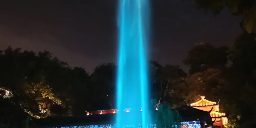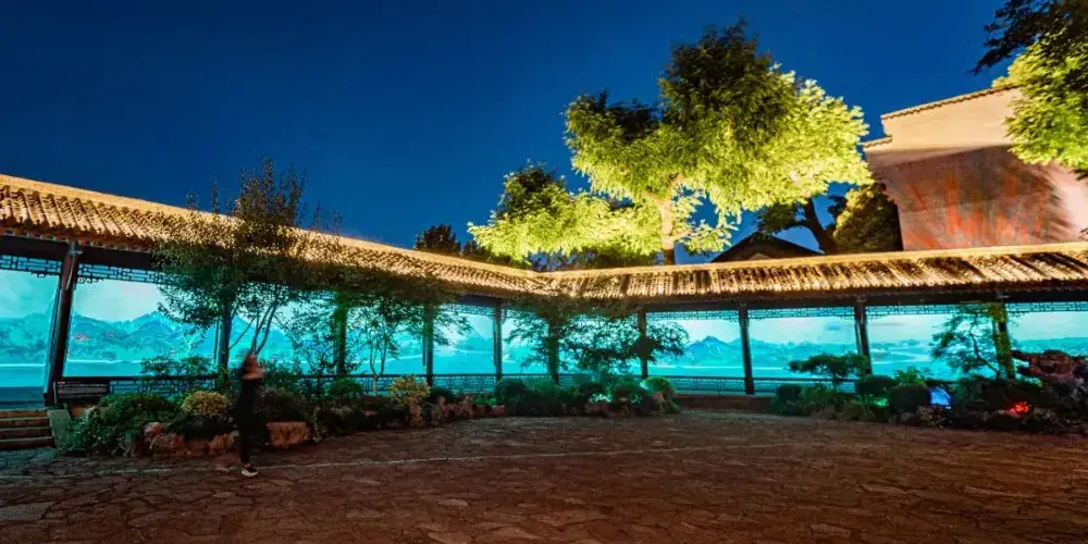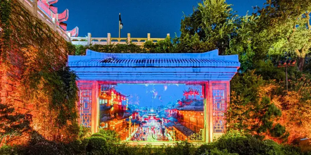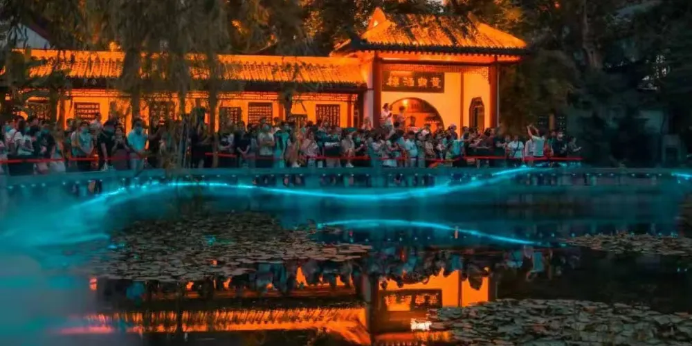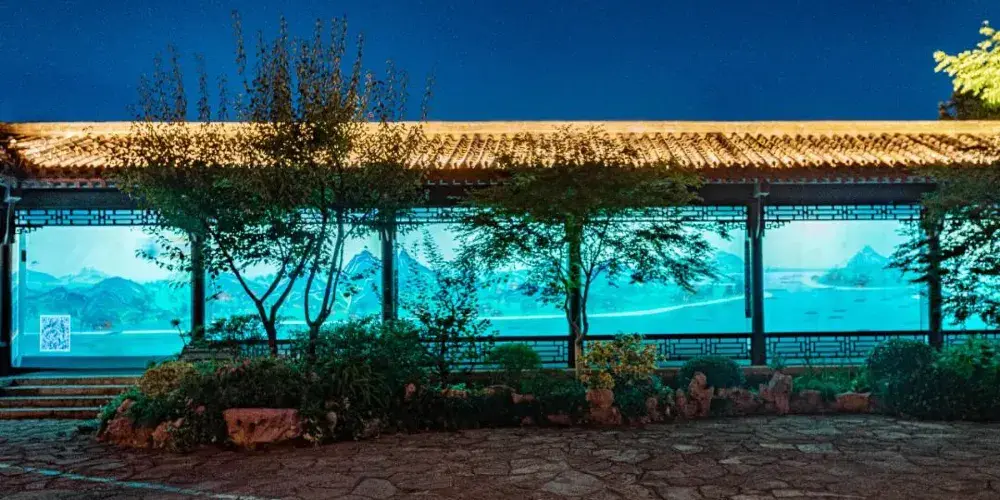 詩碑廊上淡雅的山水圖景,循環點亮不停歇。值得一提的是,最近長廊兩頭各多了一個QR code,遊客掃碼後可以在畫捲上發送實時彈幕,趕緊來體驗吧!