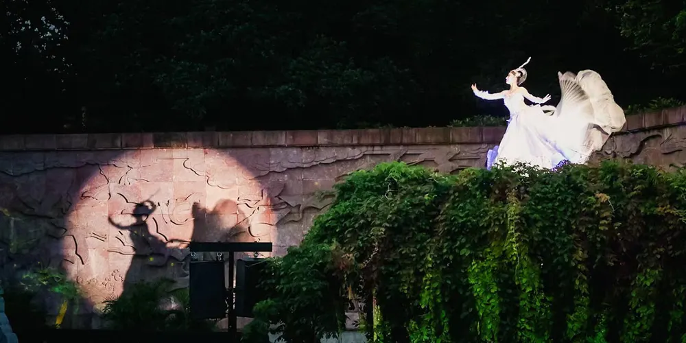 燈光投射出碧綠的荷葉,淡粉的荷花,洋溢著夏日風情。隨著《仙鶴緣起》故事的展開,黃鶴仙子在水上翩翩起舞,池中噴泉如花綻放,水幕與衣裙在燈光映照下幻化成夢幻色彩。