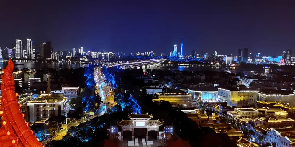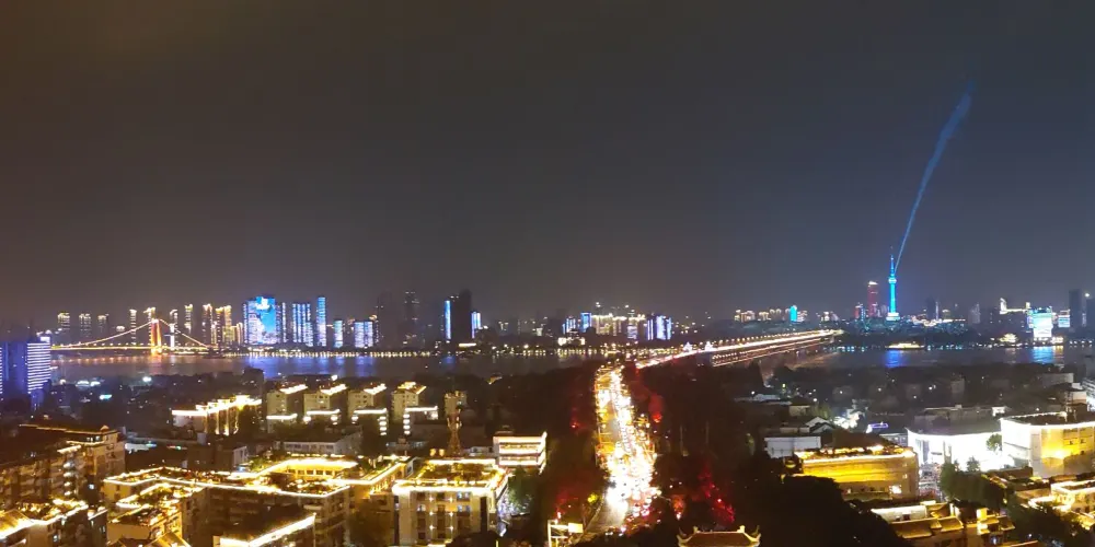 龜蛇鎖大江,黃鶴樓屹立於蛇山之巔,登上主樓俯瞰,萬里長江穿城而過,大江奔流的磅礴氣勢、城市夜景的絢爛璀璨,盡收眼底。