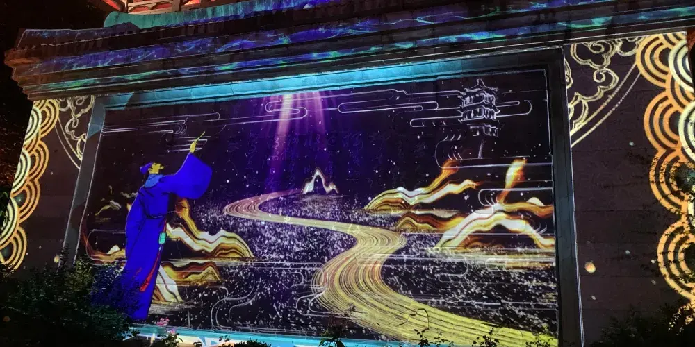 透過建築搭配動畫光影以及燈光設計的渲染,黃鶴樓膾炙人口的經典故事一一在樓體上全新演繹,畫面氣勢恢弘、光影璀璨綺麗。遊客駐足樓前觀影,歷史的滄桑撲面而來,過去的故事在眼前「活」了。