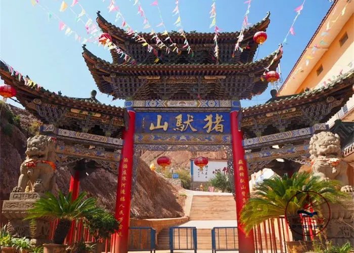 豬馱山原名萱帽山,位於苦水川西,是周圍山峰中高出的一座,是一塊佛家寶地。因本土高僧李福用豬馱磚建寺而易名豬馱山。豬馱山是康熙御封的“滲金佛祖”的得道聖地,始建於清康熙年間,300多年來,通過不斷增修,已頗具規模。此山氣溫勢超拔,山下玫瑰花似海,每逢花期,遊人眾多。