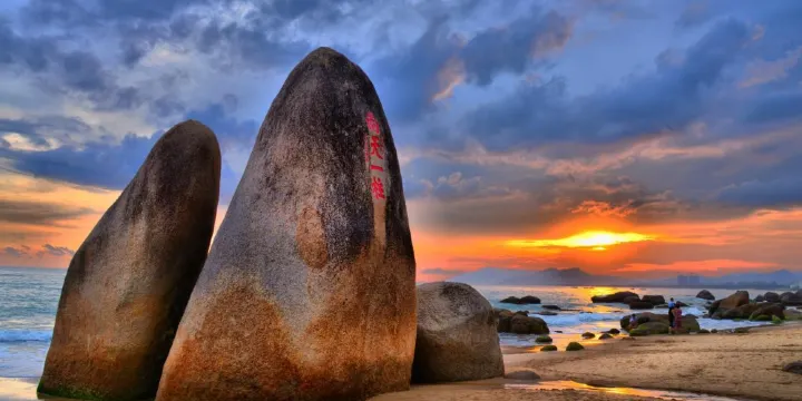 南天一柱石為一塊圓錐形海蝕花崗巖,高約為7米。千萬年來聳立在南海之濱,傲視驚濤駭浪,有獨支南天之勢。1990年版貳元人民幣的背面圖案即為此處石景。“南天一柱”四個蒼勁陽剛的大字,為清代宣統元年(1909年)崖州知州範雲梯所題。