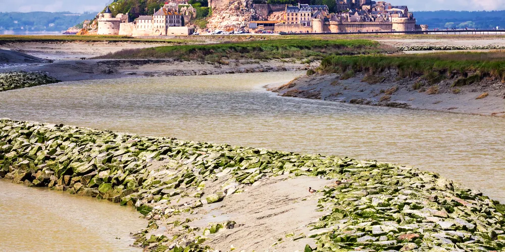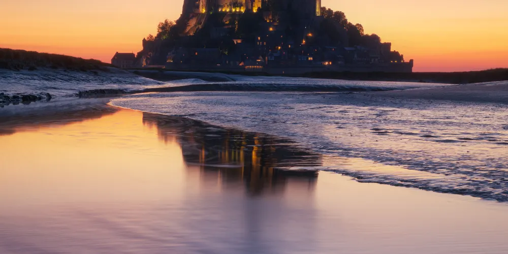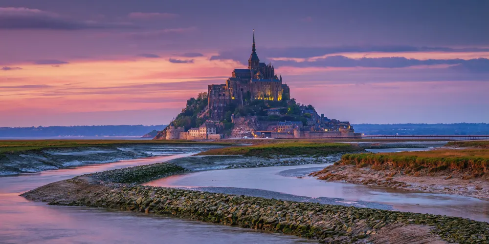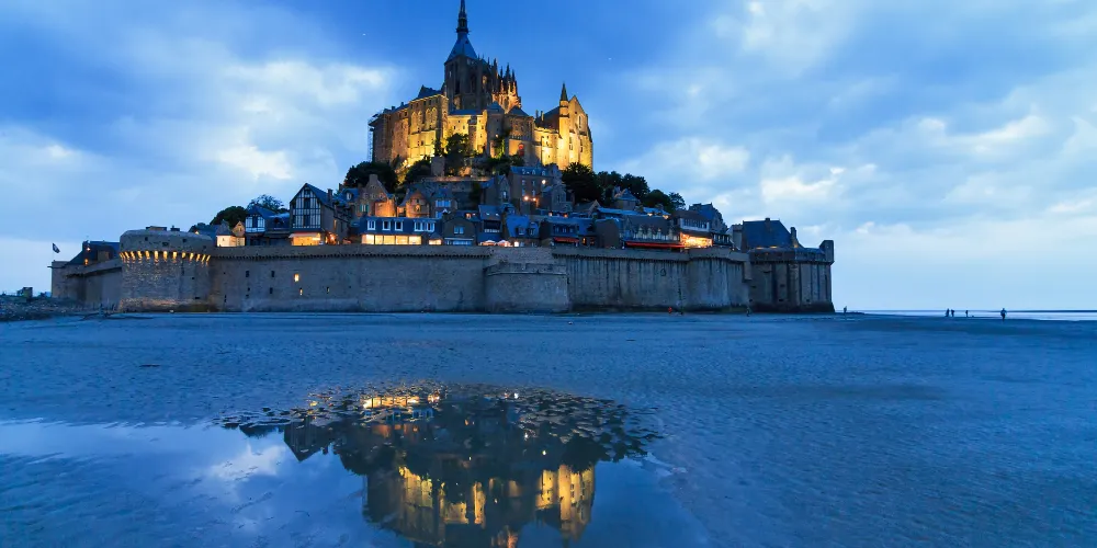 聖米歇爾山是天主教的第三大聖地,位於芒什省的一座小島上。聖米歇爾山所在的聖馬洛海灣是一片灘塗,潮汐不斷地將沉積物衝上岸,使得聖米歇爾山成為了一座孤島,只有漲潮時才浮出海面,頗具神秘色彩。每逢傍晚,大西洋的潮水如萬馬奔騰一樣將山邊的流沙淹沒,聖山頓時變成汪洋,十分壯觀。