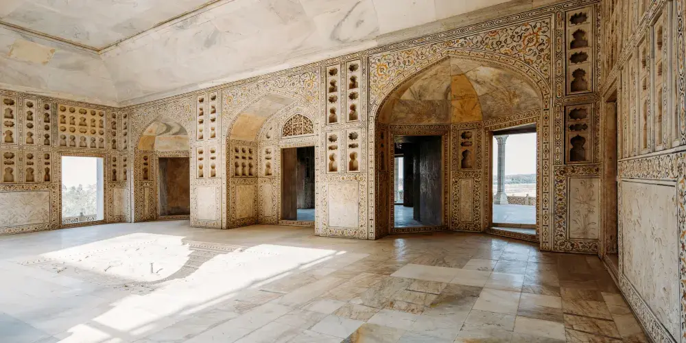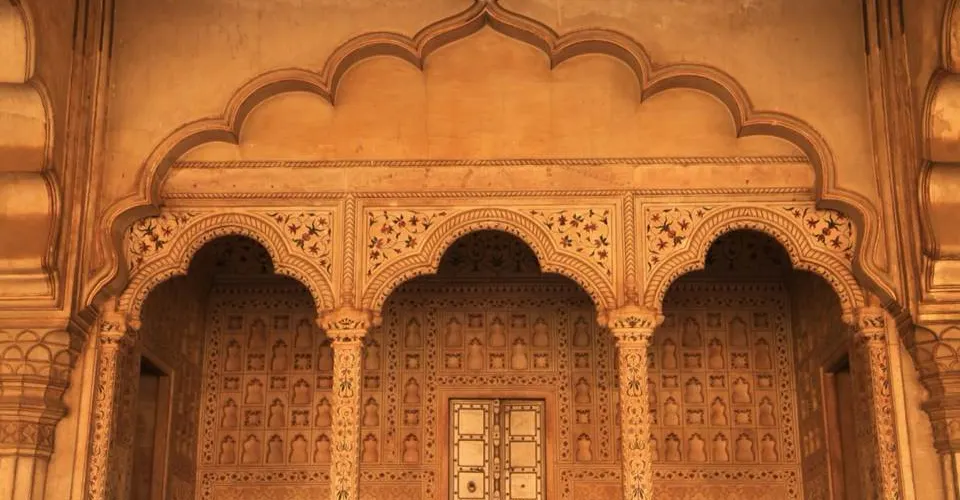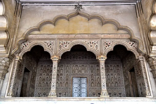 宮殿的正面左右對稱,上部兩端聳立著小塔赤砂岩牆面用白色大理石裝飾,中庭周圍是印度古典式的矩形房屋。南北兩座大廳由木質柱樑構成,托架上雕刻著精美的圖案,木簷上面還有石板房簷。面向亞穆納河的中庭具有明顯的波斯風格,南北兩面是清真塔。