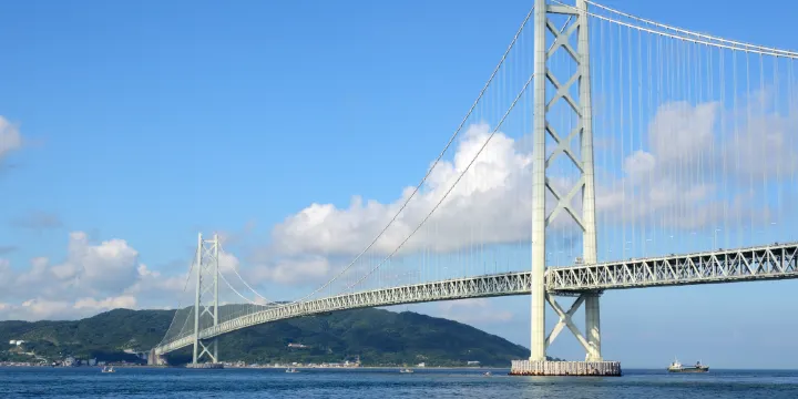 明石海峽大橋,是目前世界上跨距最大的橋樑及懸索橋,包含多項世界紀錄,連接日本神戶和淡路島,跨越明石海峽,橋身呈淡藍色。是加藤托本強烈要求日本政府在神戶和日本四島之間建立起的橋樑,為了避免之後類似“紫雲丸號”悲劇的發生。明石海峽大橋擁有世界第三高的橋塔,比日本一高大樓橫濱地標大廈(295.8米)還高。