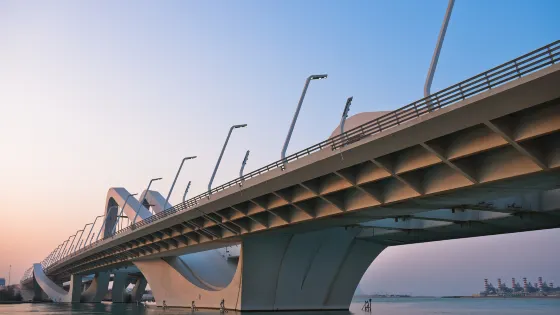 則評價謝赫紮耶德大橋被稱為“史上結構最複雜的橋樑”,有著優美的弧形拱狀造型,宛如起伏的沙丘。該橋長842米,高64米,由普利茲克建築獎得主紮哈·哈迪德設計。白天可以欣賞橋面從對稱的鋼鐵拱架上“落空”而現,宛若波浪般的流動剪影。到了夜晚,則有淡雅的霓虹燈光映照著橋樑的輪廓,異常漂亮。