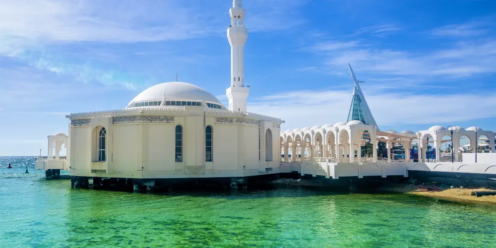 拉赫馬清真寺(漂浮清真寺)坐落於沙烏地阿拉伯吉達的紅海海岸,是一座獨特的宗教建築,以其巧妙的設計和迷人的位置而聞名。清真寺建於海岸線上,部分結構延伸至海面,給人一種漂浮於水上的視覺效果,尤其在漲潮時更為顯著。這項設計不僅體現了建築美學,也為信徒提供了一個寧靜的祈禱環境。