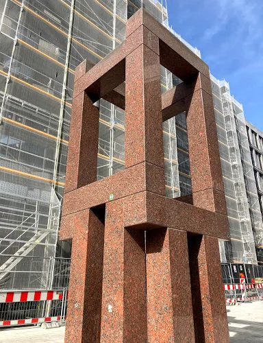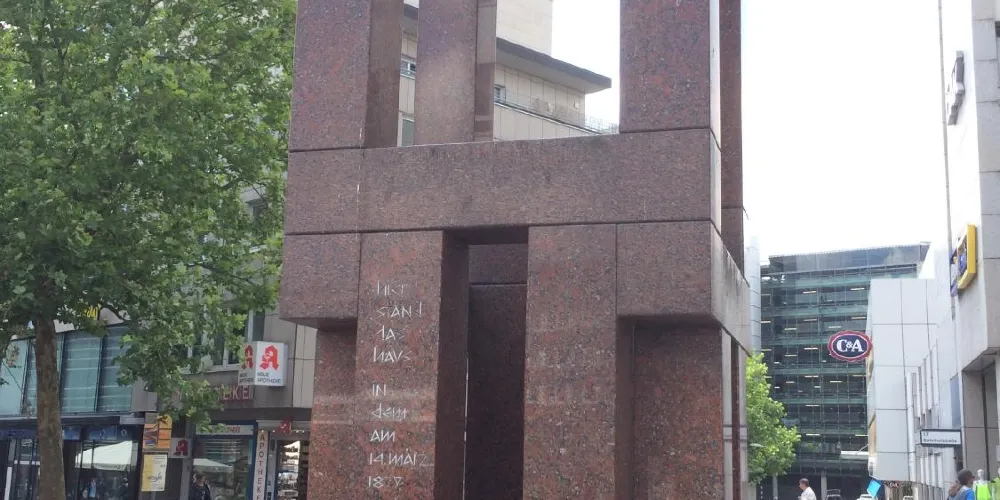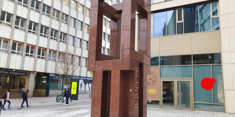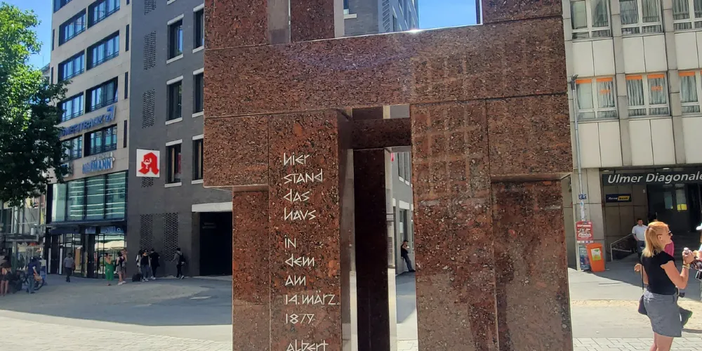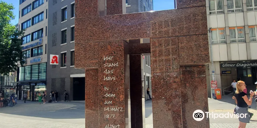 愛因斯坦誕生在位於烏爾姆站前街20號的一座房子中,該房在1944年毀於戰火。戰後在原址修建了這座紀念碑。紀念碑由12塊橫放的石頭和12塊豎立的石頭組成,象徵著白天的12個小時和夜晚的12個小時,在其中朝北的一塊石頭上鐫刻着一行字:Hierstanddashausindemam14März1879AlbeitEinsteinzurweltkam,翻譯成中文就是"有房曾立於此,1879年3月14日,阿爾伯特·愛因斯坦誕於此"。不過由於紀念碑不是很大,而且不怎起眼,非常容易錯過。