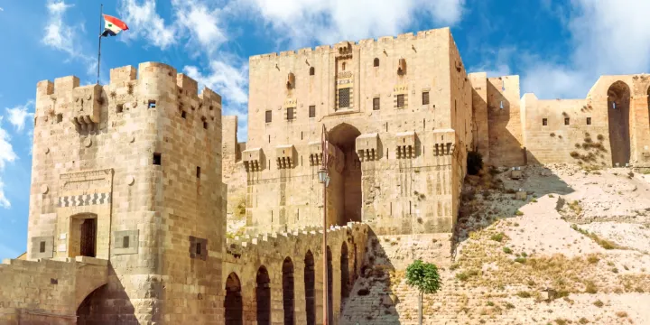 阿勒頗城堡原是古巴比倫王國和亞述王國神廟的所在地,與阿勒頗城一樣歷史悠久,據説這是世界上較為古老的城堡,曾經歷過希臘人、拜占庭人、阿尤布王朝等統治時期。雄偉壯觀的阿勒頗古城堡,聳立在城中心一座錐形的小山上,周圍是一條深20米,寬30米的壕溝。從溝底到城牆頂端共65米高。從城牆底部至壕溝成傾斜48度的光滑的石麪,右城堡以其險要堅固而聞名於世。現在有些老城區裏的房子還保留有通向城堡的隧道,是為了在敵人入侵城內後能夠進行躲避。