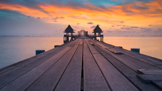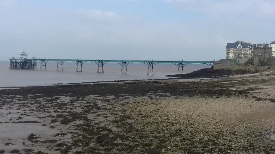 ClevedonPierandHeritageCentre精美修復的維多利亞時代碼頭。向下旋轉樓梯,可以看到碼頭的下面。從盡頭可以看到迷人的地方和美麗的日落