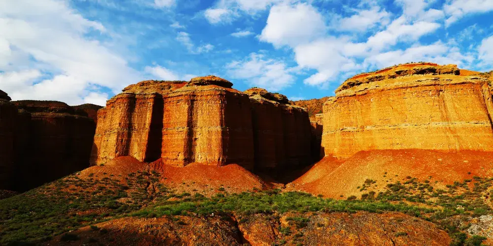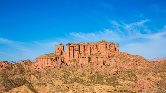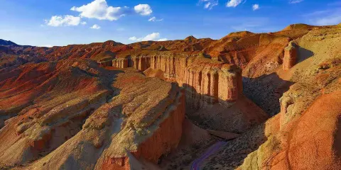 冰溝丹霞景區位於張掖肅南裕固族自治縣,是以赤紅的宮殿型丹霞地貌為主的自然風景區。這裡與不遠處的張掖丹霞地貌景區(又稱七彩丹霞)相比,丹霞的顏色比較單一,變化不大,但景區的主要特色便是這裡丹霞地貌的形狀非常獨特,有各種風格的造型,規模非常大。而且,由於這裡開發較晚,與七彩丹霞相比遊人少很多,可以安靜的觀景遊玩。