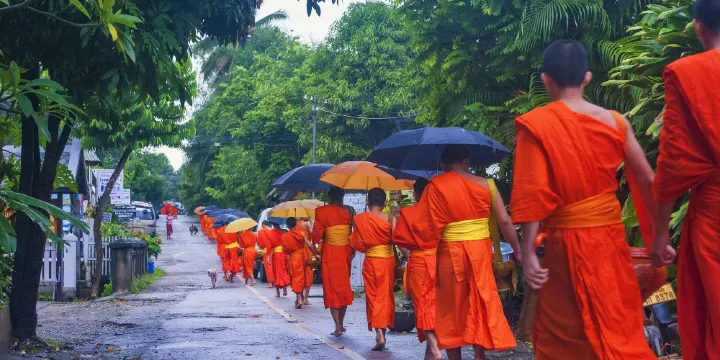在琅勃拉邦的古城區觀看布施儀式是決不能錯過的體驗,布施是小乘佛教國家保持了千百年的佛教傳統。一般遊客觀看布施會集中在洋人街(Sisavangvong Road)的廟宇附近。清晨五六點,就會看到僧侶們光著腳,背著錫鉑接受信徒或遊客贈予的食物。