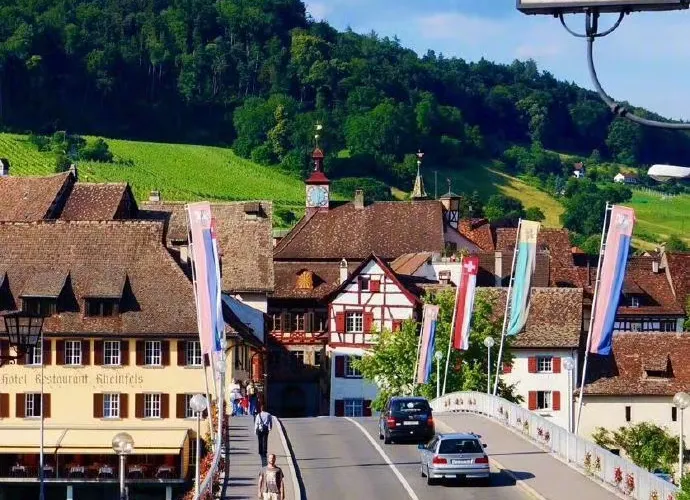 莱茵桥横跨在莱茵河之上,将城镇的南北两岸连接起来,桥的总长约110米。走在莱茵桥上可以欣赏两岸的风景,如同步行在画里,河边的木格子房子有显著的德式特征。