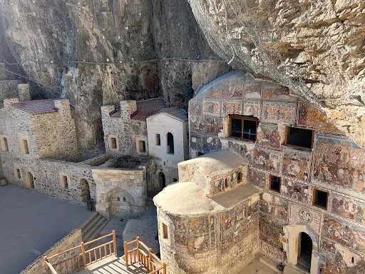 黑海地區自古便是多元文明交匯之地,孕育了深厚的歷史與豐富的文化遺產,而坐落在特拉布宗阿爾特溫德河谷陡峭懸崖上的蘇美拉修道院,無疑是這片土地上令人嘆服的標誌之一。 「蘇美拉(Sümela)」一名源自希臘語“melas”,意為“黑”,通往修道院的沿途路標上寫著土耳其語名稱“處女馬利亞(Meryem Ana)”,指引大家前往這一聖地。千年聖地:修道院供奉聖母瑪利亞,始建於西元4世紀。相傳,兩位來自雅典的僧侶巴拿巴與夫羅尼奧斯受聖母指引,來到這一帶山區,在一處山洞中發現了馬利亞聖像,於是建造了這座修道院。另有說法認為,修道院的興建是拜占庭皇帝為傳播教徒信仰而委建,隨後修道院與皇室保持密切聯繫。千餘年間,修道院幾經荒廢、擴建與重修,然而,即使在今天,這些壁畫仍能讓人窺見其昔日的輝煌。建築美學:修道院海拔約1200米,依山而建,建築群沿懸崖錯落排列,形成獨立的庭院體系。洞窟建築嵌入山壁,外部半圓形建築與之相連,內外牆面覆蓋著精美的濕壁畫。現存壁畫多為1740 年修復的作品,色彩鮮豔絢麗,千年之前拜占庭時期的原畫雖已不存,卻依舊讓人感受到歷史的厚重與宗教信仰的莊嚴。私藏路線:徒步登臨修道院的過程,是心靈的洗禮,也是一次生活的尋訪。沿途可俯瞰河谷的綠景和層疊山巒,步入修道院後,在靜謐中感受千年歷史的迴響。蘇美拉修道院不僅是土耳其的文化瑰寶,更是探索黑海歷史、宗教與藝術遺產的重要窗口。