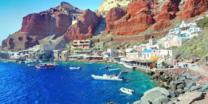 聖島上美麗的港口,位於Oia的山腳下,位置距離聖島的很贊日落點也不遠,可以開車下到這裡,一邊觀賞日落一邊享用海鮮大餐,港口附近匯聚了幾家海鮮餐廳,直接將當天打撈的海鮮作為食材,新鮮又美味。