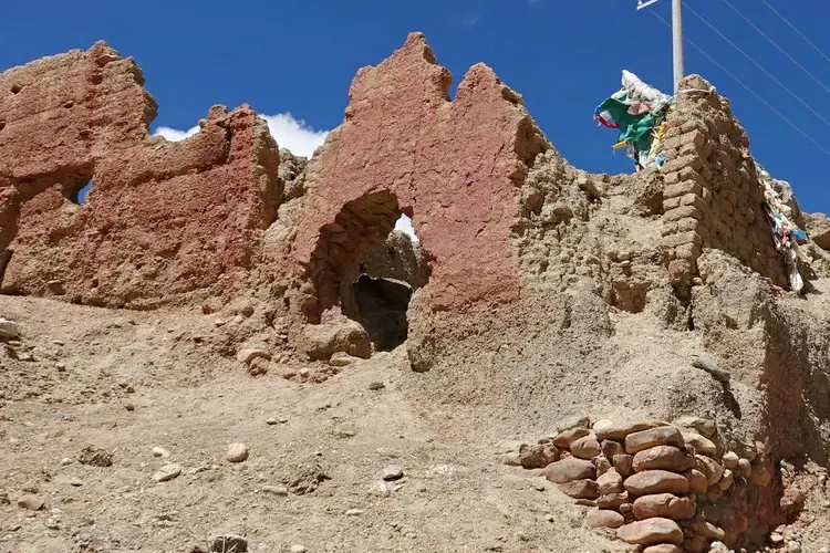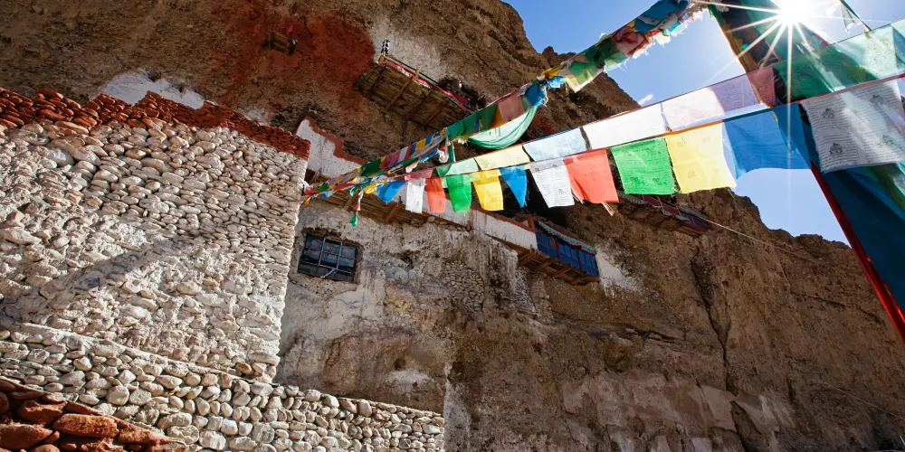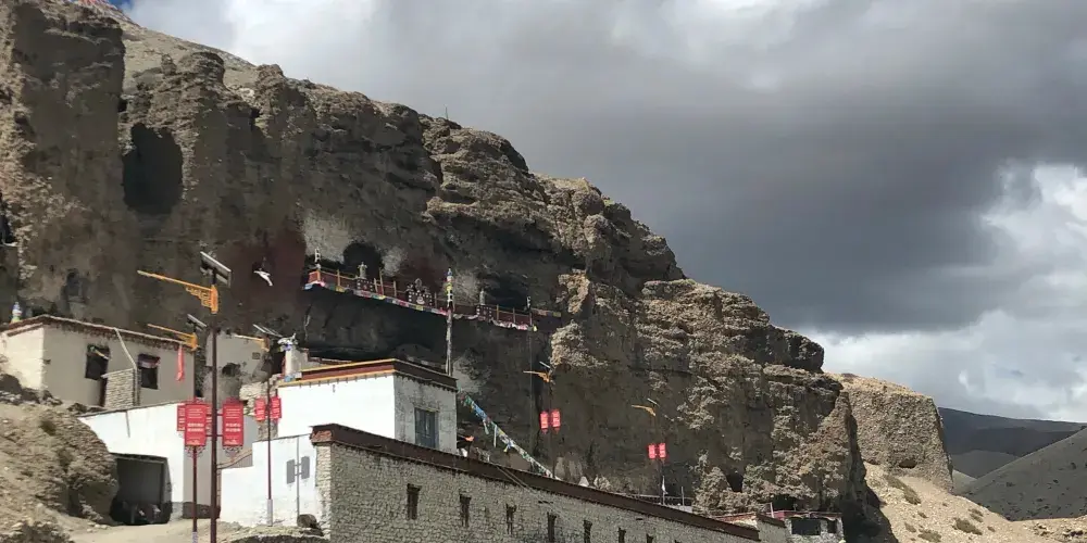 普蘭懸空寺位於西藏阿里地區普蘭縣西北方向的懸崖之上,也稱為“飛來寺”,高約30米,寺廟全長25米。從外觀上看,寺廟和棧道是懸在空中的,是座名副其實的懸空寺。懸空寺上斜掛數條經幡迎風飛舞,傳説中這就是仙女引超拉姆飛往天庭的地方。引超拉姆是八大藏戲之一《諾桑王子》的主人公諾桑王子的王妃。