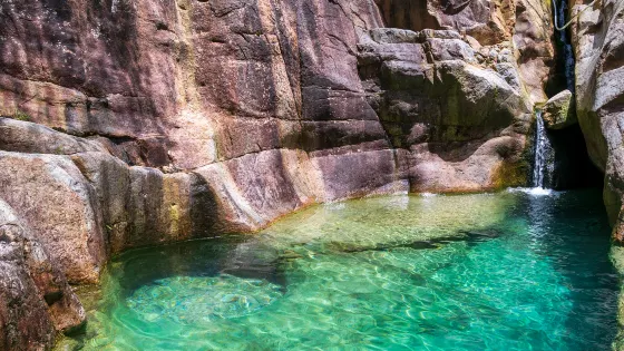 芙蓉溪(福州天使之淚)位於福州晉安區壽山鄉,因山坳中一處水潭碧綠如玉、清澈見底,而被稱為“天使之淚”。芙蓉溪中曾經盛產芙蓉石,在溪流上游有一個村莊為芙蓉村,芙蓉溪由此得名。從市區有大巴車前往芙蓉村,大約一小時的車程。在村中下車後,需走漫長的山路,還要蹚過溪流,穿過樹林,徒步一個多小時,才抵達“天使之淚”。“天使之淚”嵌於白石山谷,深約三四米,或是含有礦物質的原因,潭中的水格外瑩藍清透,靈動冰涼,景色猶如仙境。