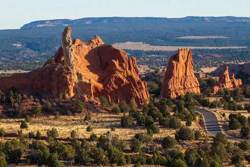 柯達盆地國家公園是一座以石頭出名的猶他州州立公園。這裏的地貌非常特殊,公園內都是一根根顏色各異的煙囱石,因其外形酷似煙囱而得名。路邊還經常會出現大叢的黃色野花,給這片荒蕪的土地增添了一份生機。日落和日出是公園很美的時間,金黃的陽光灑在紅色的大地上,令人沉醉。