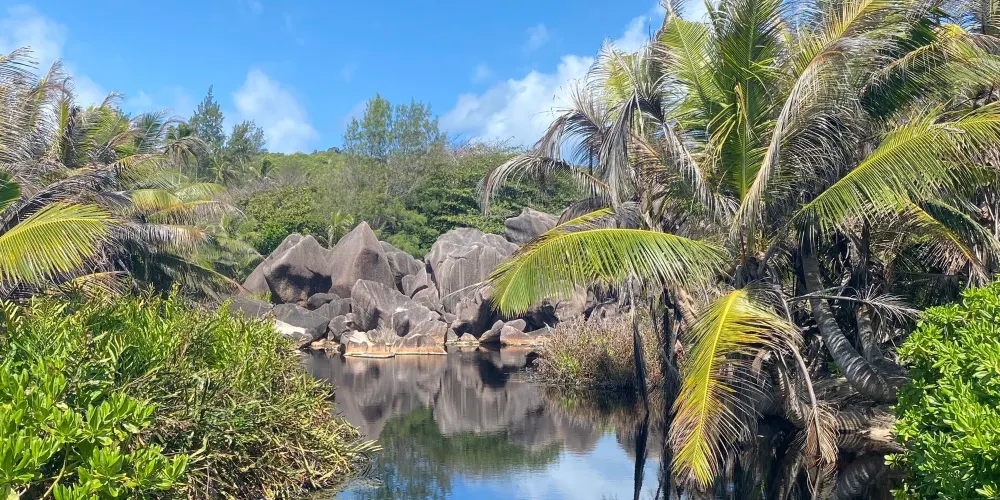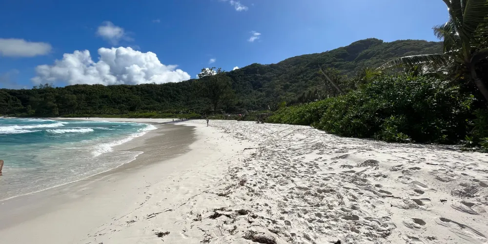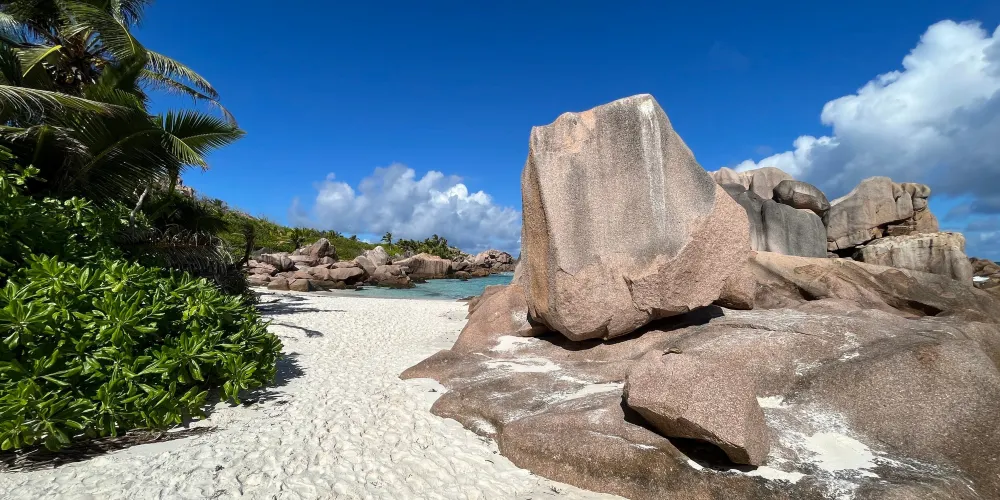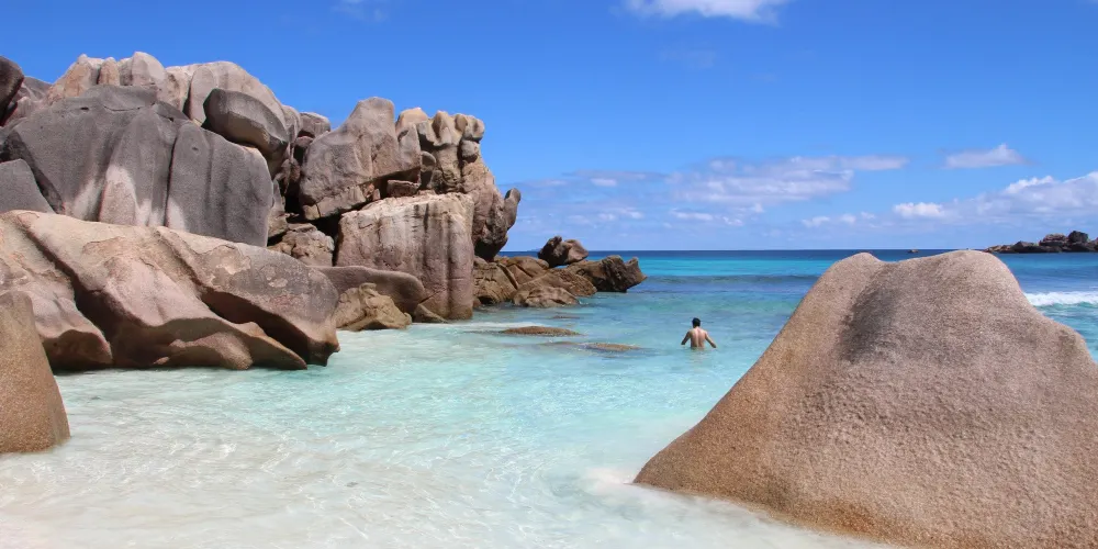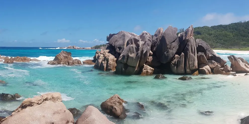 科科斯海灣的海灘是拉迪格島上的三聯灘之第三灘,從二灘翻山過來,大約要半個小時路程,它相對於二灘更考驗體力。該沙灘因海灘上的枯枝和大塊岩石顯得比前兩灘更有味道。