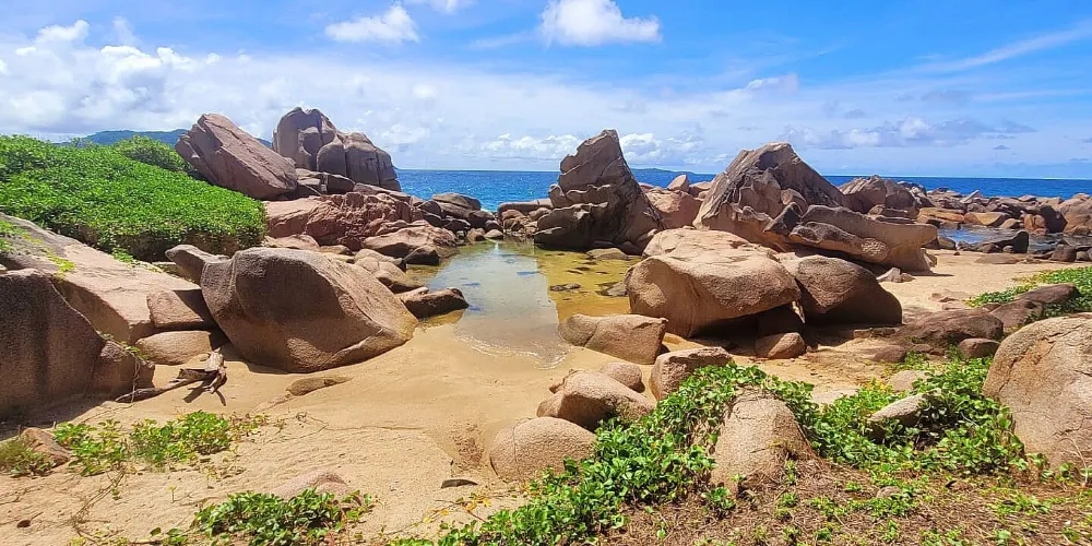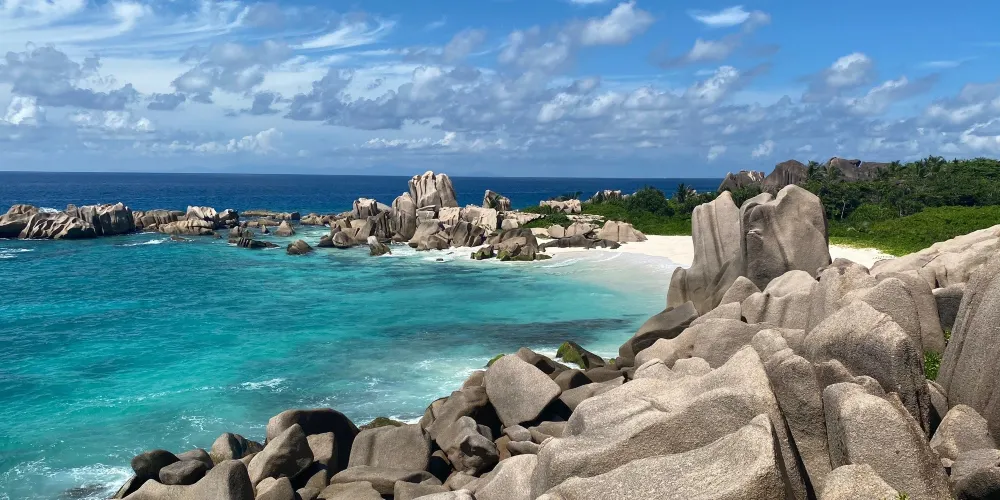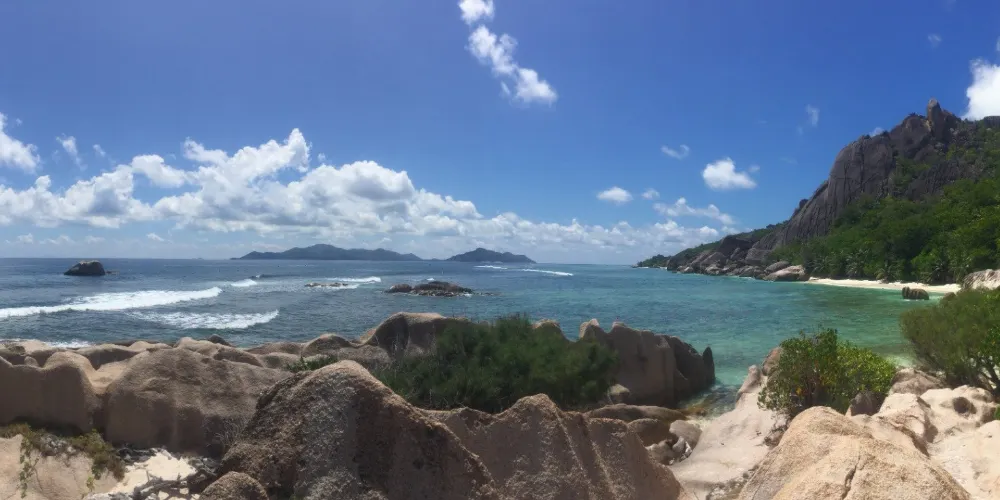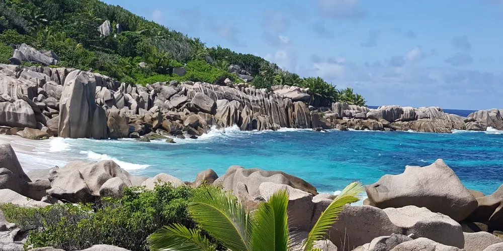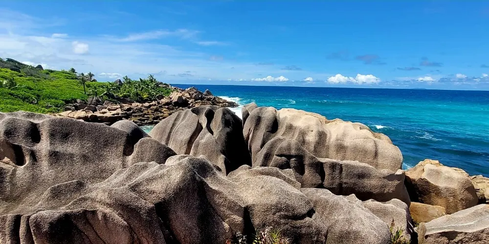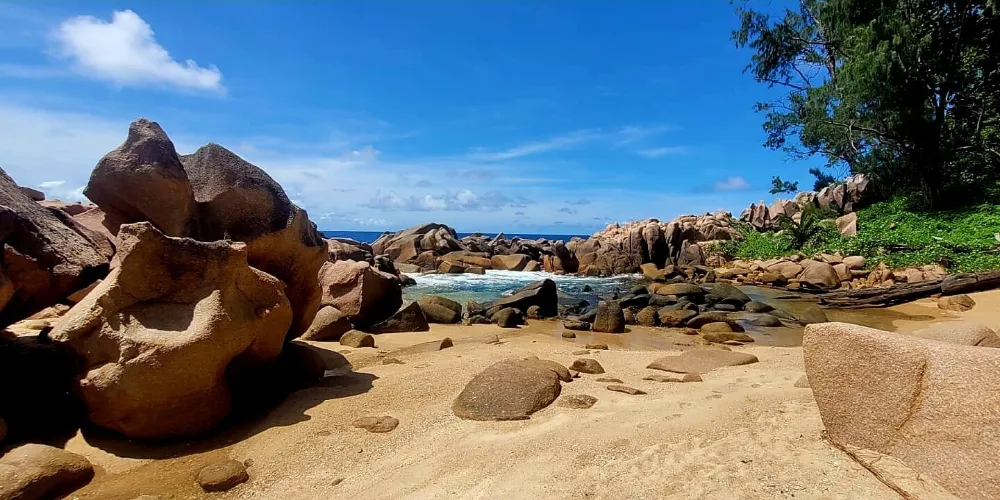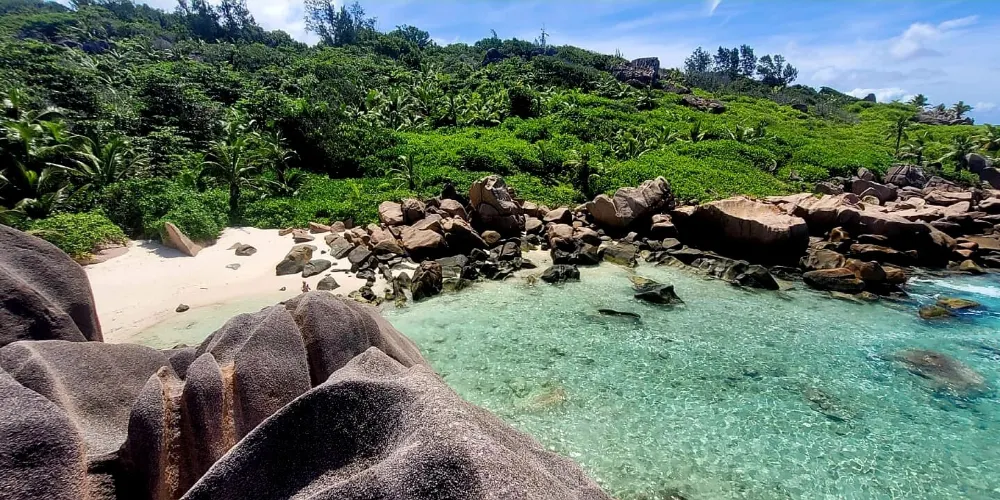 則評價科科斯海灣的海灘是拉迪格島上的三聯灘之第三灘,從二灘翻山過來,大約要半個小時路程,它相對於二灘更考驗體力。該沙灘因海灘上的枯枝和大塊岩石顯得比前兩灘更有味道。