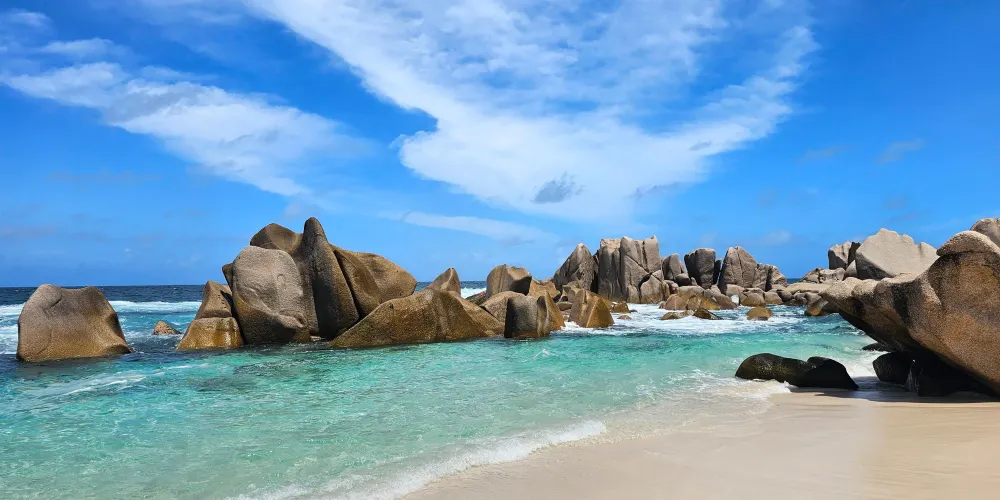 則評價德阿讓海灘又名銀色之源海灘,位於拉迪格島西部的聯合農場內。這是世界上最美沙灘之一,也是世界上被拍攝次數最多的海灘之一。明晃晃的白沙灘上到處都是奇特而優美的岩石,拍到片子裡非常富於表現力和原始感。