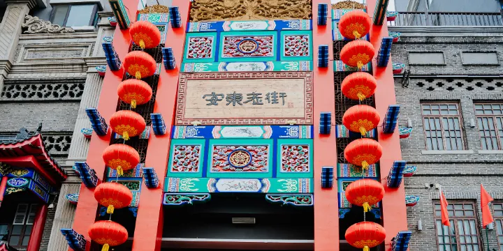 安東老街建築外形主要參照丹東二十世紀二、三十年代老街號建築形式,複製了一部分標誌建築、老街名在項目裏,採用了民國時期主要建築符號做外牆及街景裝飾,分為老安東美食街、安東旅遊接待服務中心兩部分,是集懷舊觀光、經典美食、旅遊購物等於一體多功能文化商街。外街以及內街商鋪借鑒老安東經典建築元素,配合老物件和街景雕塑,設計再現老街景,包括百年老字號、品牌餐飲、東北特產、海產品、風味小吃、地方戲表演、以及各種民間藝術,分別以安東時期繁榮一時的中富街、天后宮街、興隆街、聚寶街等著名老街命名。