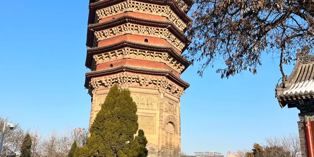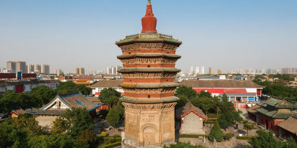 安陽天寧寺位於安陽市文峰區文峰南街,又叫文峰塔,是古城安陽標誌性建築。寺廟的整體呈上大下小,外形像一把傘;塔基上是一個圓形的蓮花座,蓮瓣有七層;塔身刻有磚雕,生動有趣、神態自然。登上寺廟,視野開闊,向四周望去,安陽古城美麗景色盡收眼底。