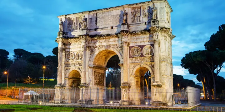 該建築是人們為紀念君士坦丁大帝而建築的。該建築擁有三個拱門,用羅馬水泥建成。該建築上的雕塑大多都是浮雕,而且其中一大部分是從歷代皇帝的建築上蒐集過來的,其中比較知名的是頂端的八塊浮雕,他們是從馬克奧爾略皇帝紀念碑上拆卸下來的。據說當年,拿破崙來到羅馬後見到了該建築,非常喜歡很是稱讚。