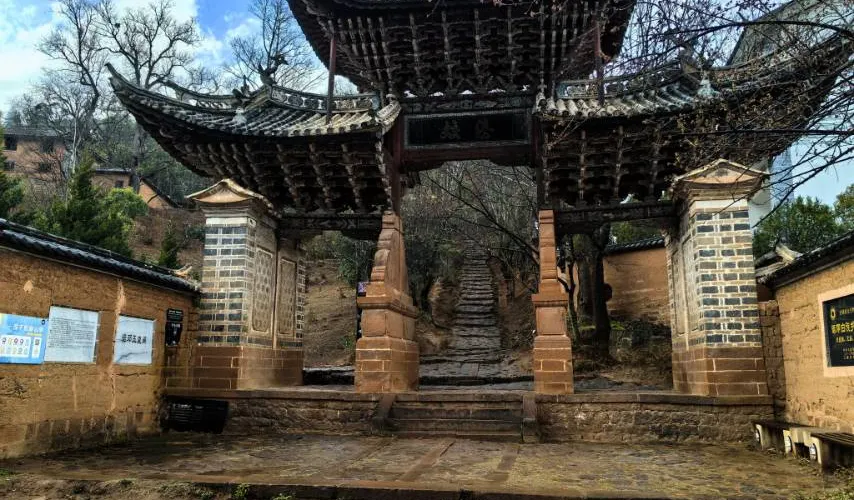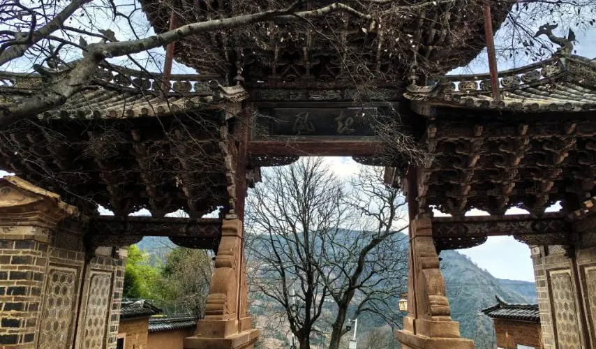諾鄧文廟前有“欞星門”,這是滇西地區現存較大也是較為古老的木牌坊,始建於清初,四柱三楹、飛檐斗拱,又叫“騰蛟、起鳳”坊。