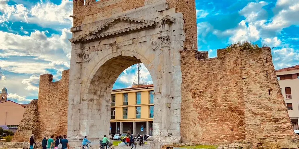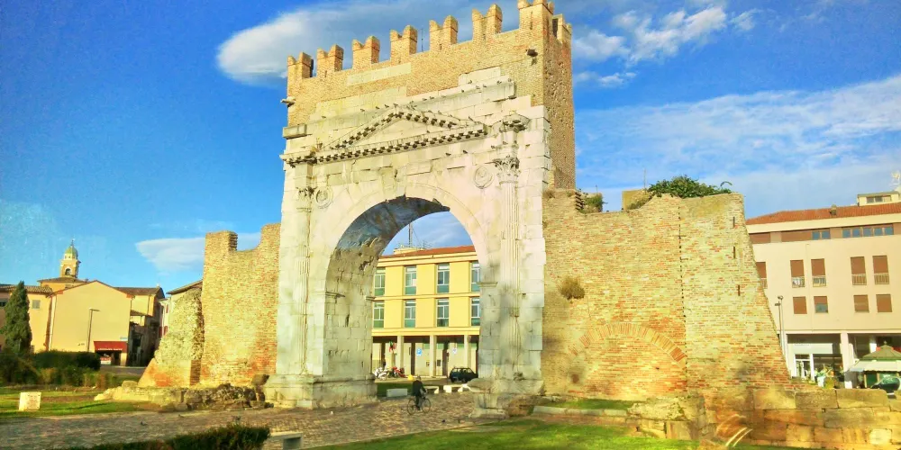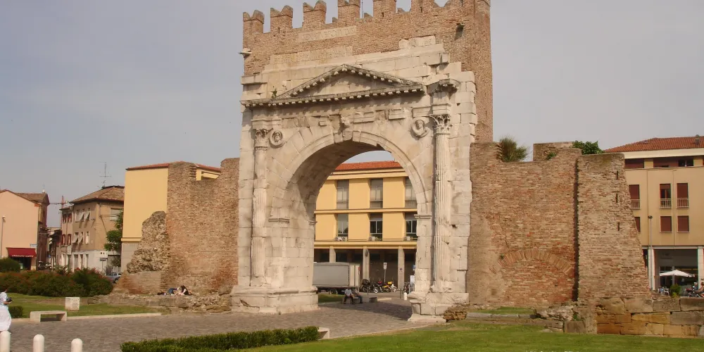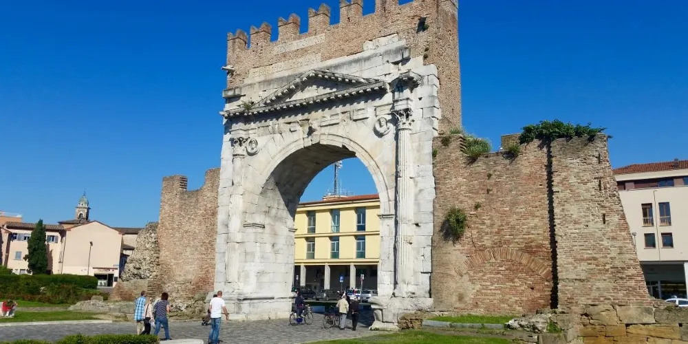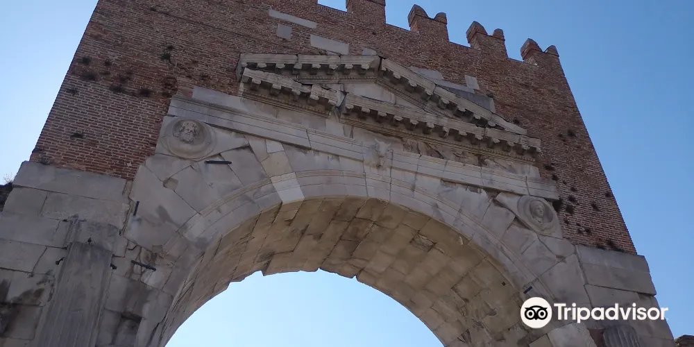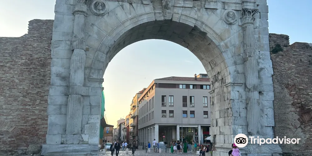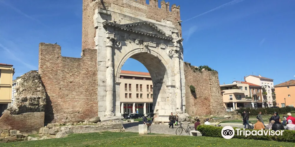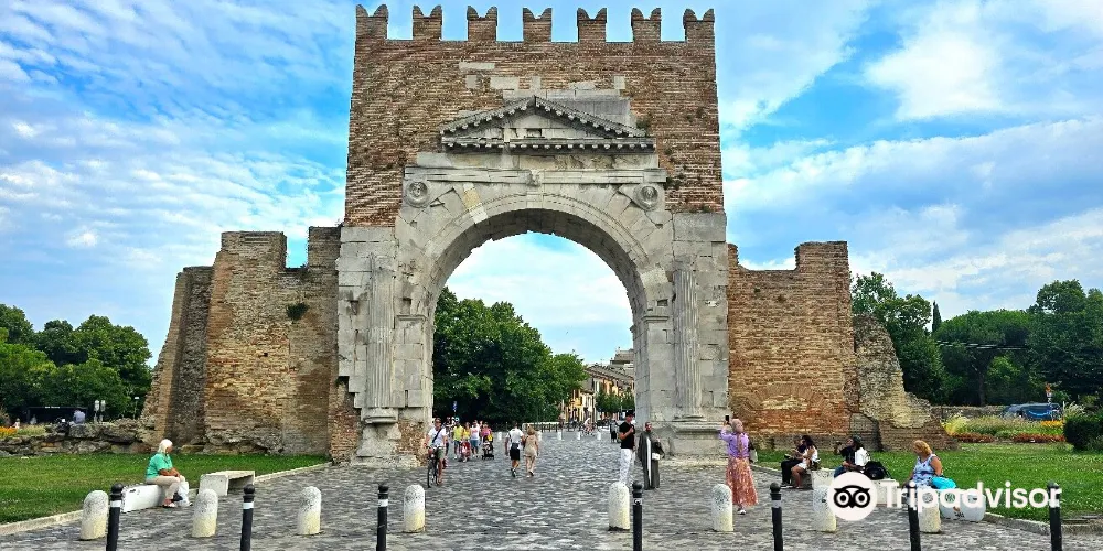 奧古斯都拱門建於公元27年,弗拉米尼亞大道和艾米利亞大道交匯於此,它是公元前27年羅馬元老院獻給奧古斯都皇帝的拱門,也是目前保存的較為古老的羅馬拱門。拱門的風格簡單而莊重,頂部有城垛,是裏米尼的標誌之一。