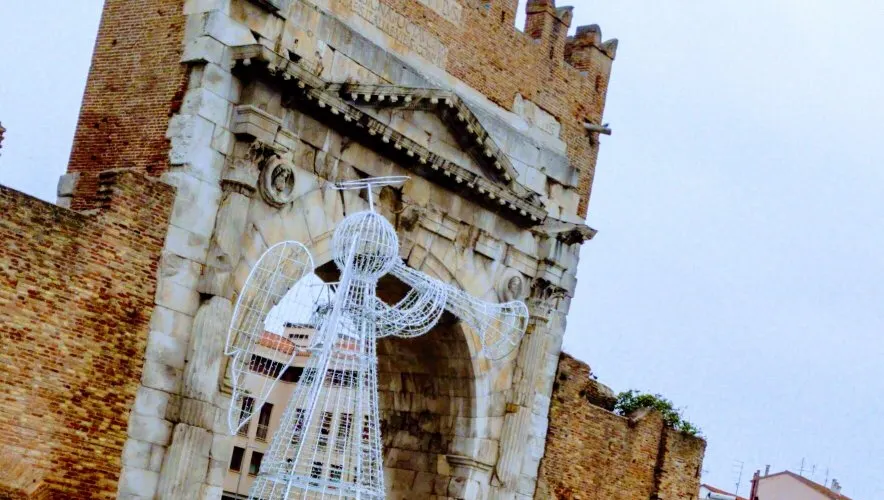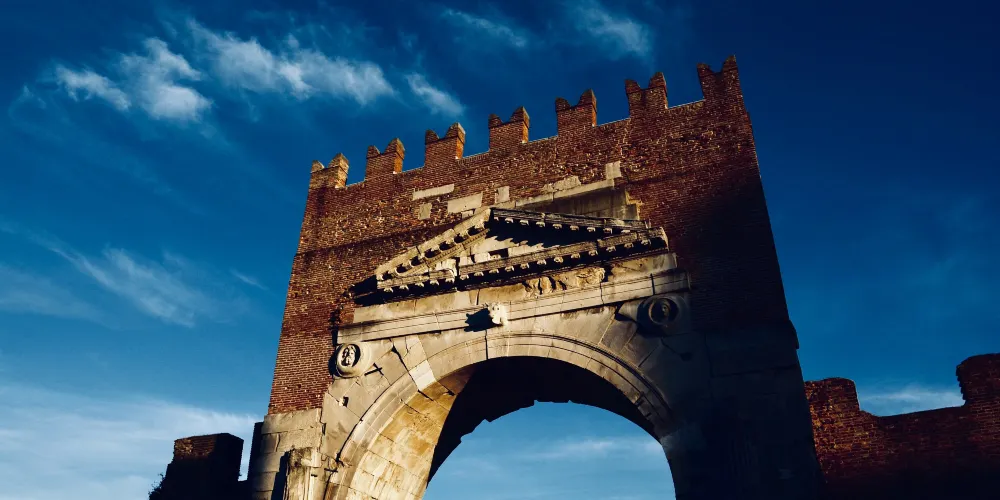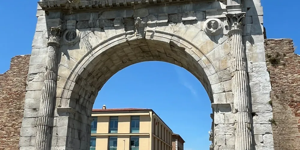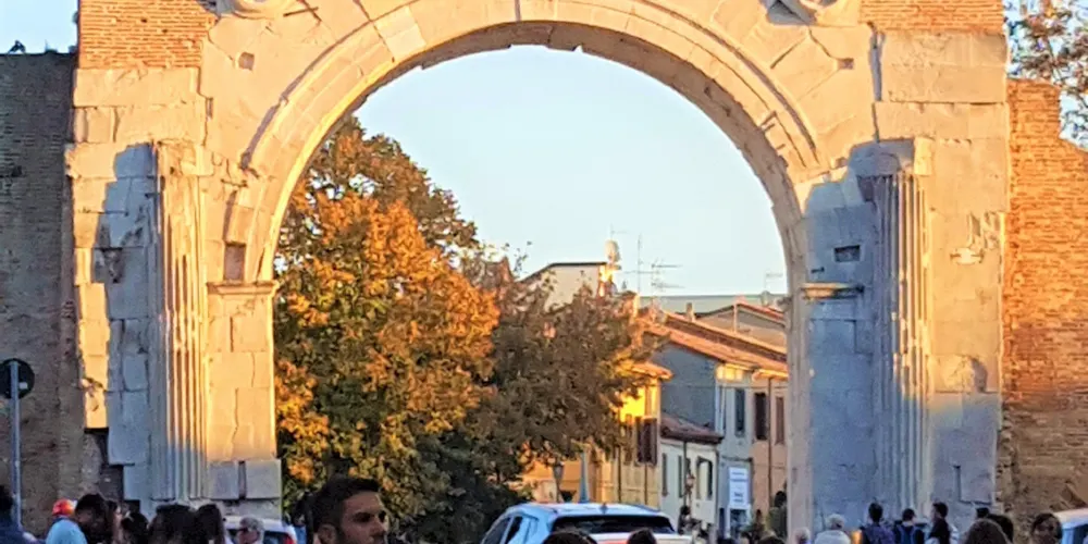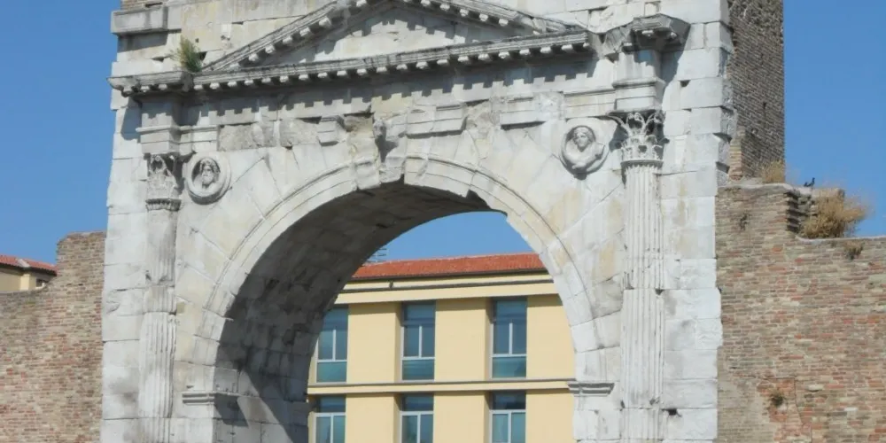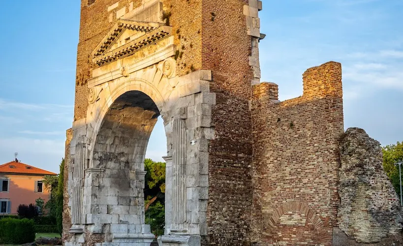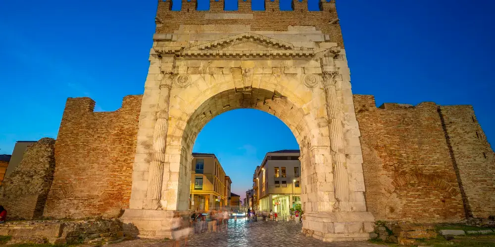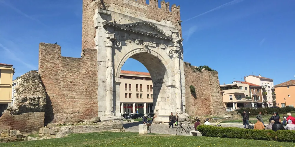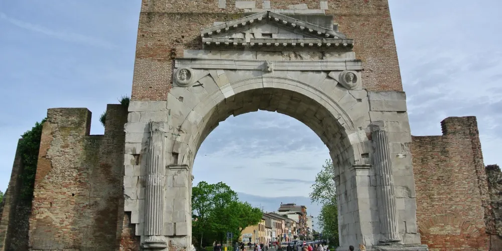 奧古斯都拱門建於公元27年,弗拉米尼亞大道和艾米利亞大道交匯於此,它是公元前27年羅馬元老院獻給奧古斯都皇帝的拱門,也是目前保存的較為古老的羅馬拱門。拱門的風格簡單而莊重,頂部有城垛,是裏米尼的標誌之一。