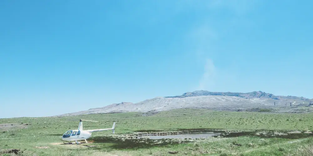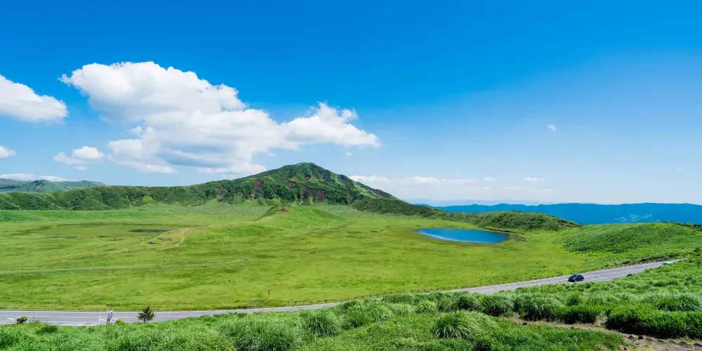 草千裡是一片淺四角形的大草原,延伸到烏帽子嶽的北麓,中央有很大的池塘和放牧的馬群,一派生機盎然的景象。