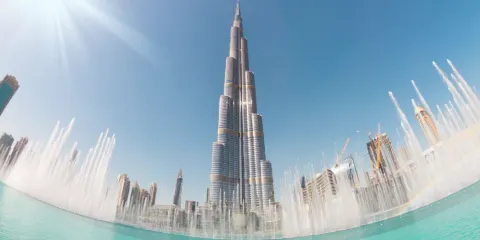 迪拜音樂噴泉位於迪拜購物中心和哈利法塔旁邊的人工湖上,這裡每天都會上演多場壯麗的噴泉表演,遊客們可以在逛完杜拜購物中心或者參觀過哈利法塔後駐足於此觀看。噴泉可以噴到150米,相當於一棟50層樓的高度。高高低低的水柱隨著悠揚的音樂舞蹈,非常壯觀、美妙。