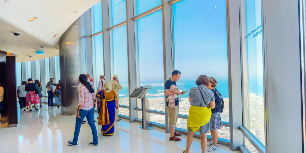 乘坐雙層電梯以每秒 10 米的速度直接到達 124 層! 不到 60 秒,電梯就到達觀景台,設有室外露台。 欣賞周圍酋長國的壯麗景色,欣賞令人驚歎的 360 度全景。 瞭解有關這一建築奇蹟背後的設計和技術的所有知識,同時使用甲板上的望遠鏡欣賞這座城市的現代和歷史景觀。