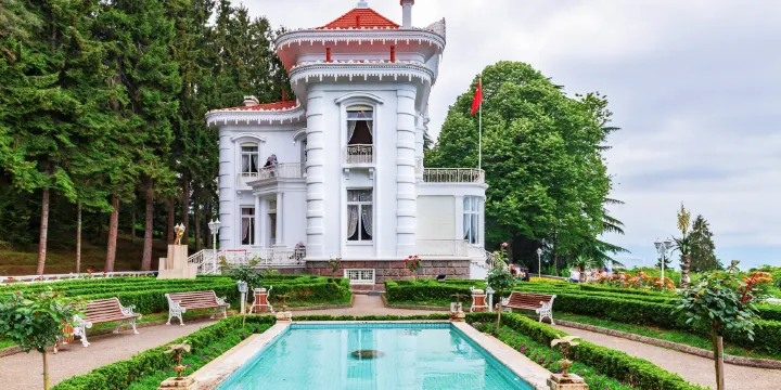 在擁有壯麗美景與深厚歷史的特拉布宗(Trabzon),阿塔圖爾克別墅(Atatürk Pavilion)隱匿於森林中。阿塔圖爾克別墅起源於一間旅館。在土耳其共和國成立後,阿塔圖爾克訪問特拉布宗,受到當地市民的熱烈歡迎,下榻在Soguksu Lodge旅館。旅館建於1913年,共四層,設有地下室,三樓的大房間便是當時阿塔圖爾克的臥室。之後,原屬私人管理的旅館被特拉布宗市政府購下,贈送給阿塔圖爾克作為禮物,特拉布宗人民為此將旅館命名為“阿塔圖爾克別墅”,並為此感到自豪。在阿塔圖爾克訪問特拉布宗時,他將這座建築獻給偉大的人民,並在公證人的見證下,將所有財產捐贈給國庫。阿塔圖爾克去世後,特拉布宗市政府將阿塔圖爾克別墅對外開放,作為博物館展示阿塔圖爾克的遺物和照片。別墅入口處展示著阿塔圖爾克第一次抵達特拉布宗時的完整演講。除了餐廳外,各房間分別陳列了阿塔圖爾克生前訪問期間的各種照片,以及使用過的扶手椅和沙發。別墅三樓設有臥室、浴室、隨從房和書房。如今,這座別墅及其寬敞的花園成為特拉布宗美麗的房屋之一,並在特拉布宗市政府管理下作為阿塔圖爾克博物館向遊客開放。
