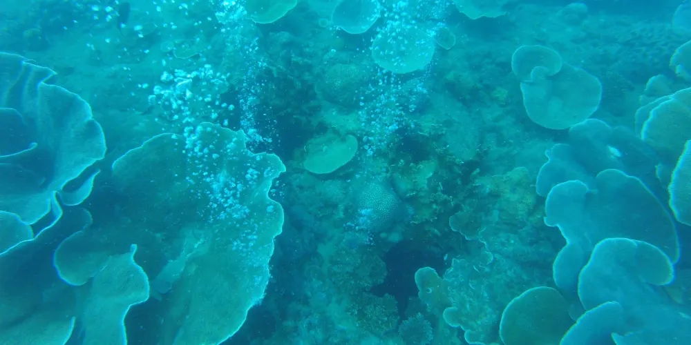 這裡是一個小島,島周圍是一個淺灘,下船的地方很淺,一米左右,然後往外路的地方遊去,穿過一片水草,就可以在水下看到很多珊瑚和小魚,那些地方也只有2米左右的深度。