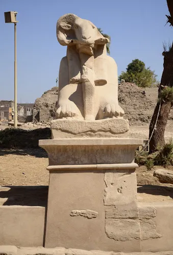 神廟由磚牆分隔成三部分,其中中間的部分保存較完好,也是面積較大的一部分,它是獻給太陽神阿蒙(Amon)的。左側的是獻給蒙圖(Montu)神的,而另一個是獻給阿蒙神的妻子——形為禿鷲的穆特(Mut)女神,但現在尚未發掘。此外,建築群中還有大大小小幾十座各式神廟。在通往神廟塔門的神道兩旁,有兩排獅身公羊頭的雕像。據說,歷史上這條由羊首獅身像護衛的神道,一直通往3公里外的盧克索神廟在整個神廟裡可以看到很多壁畫、雕像、柱子都是用泥土和石塊將支離破碎的古蹟重新復位、黏合在一起的。這是因為神廟從開始建造至今已有4000多年,建造完畢至今也有2000多年。由於人為和自然的破壞,神廟曾經面目全非。不知經過了多少年和多少考古人員的心血才將目前的神廟展現在世人面前。