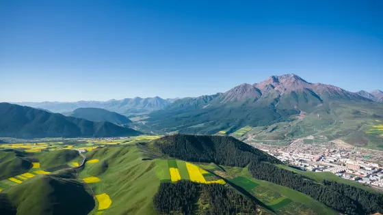 牛心山又名“阿咪東索”,意為“千兵哨卡”,裕固族稱之為“乃曼額爾德尼”,意為八寶山,因阿咪東索四周地形如八寶而得名,是一座當地少數民族心中的神山。對於旅遊者來說,阿咪東索的景色非常絕妙,那就是一山四季的奇觀,山體底部麥浪翻滾,鳥語花香,一派高原河穀的農家景象,春意盎然;山麓綠草如茵,是優良的牧場,夏意融融;中部或稍向上的廣闊區域為灌木叢林,儼然一派林海風光,秋意瑟瑟;舉目向上從稀疏植被逐漸過度到石山,峰頂常年積雪不化,冬意聖潔。