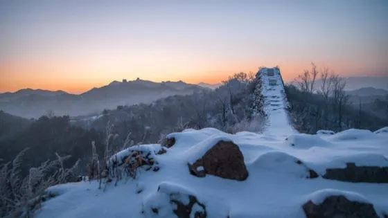 ▲ 冬日的八達嶺長城在皚皚白雪的覆蓋下,宛如一條銀色巨龍蜿蜒於群山之間,晨曦的金光灑在城牆上,勾勒出一幅靜謐而壯麗的畫卷