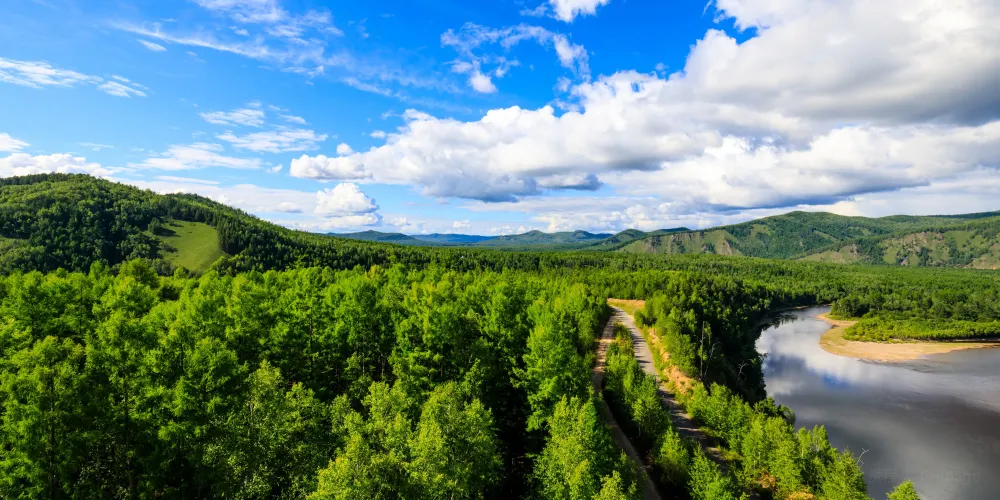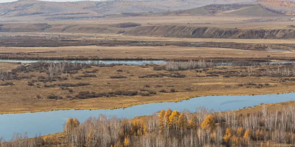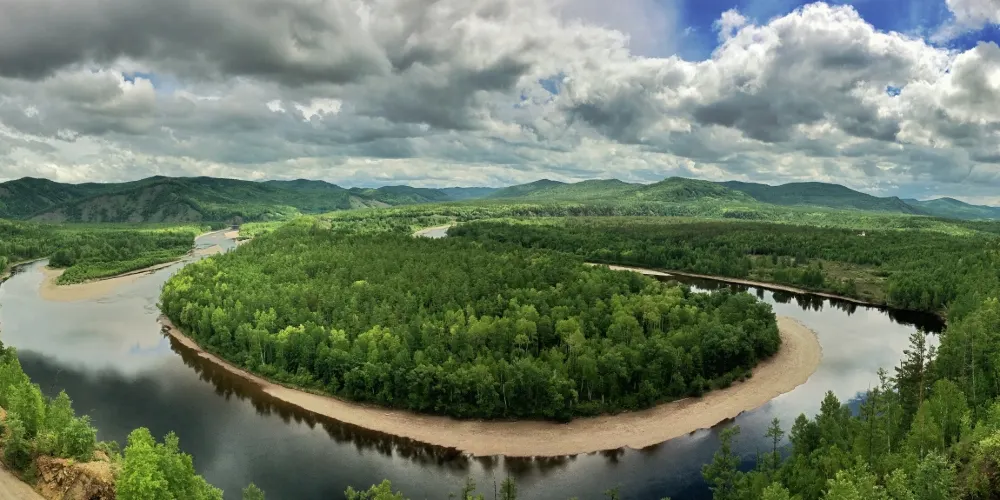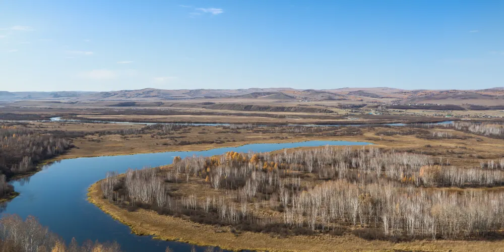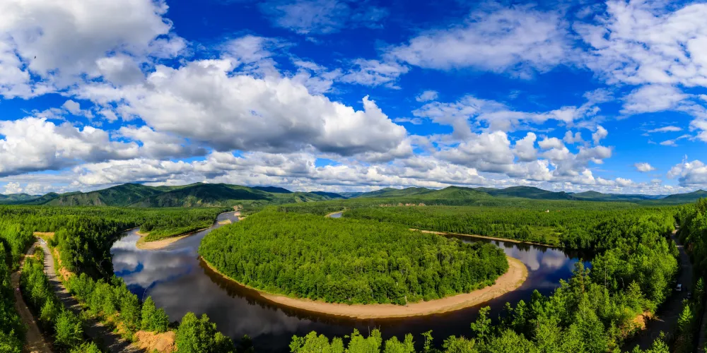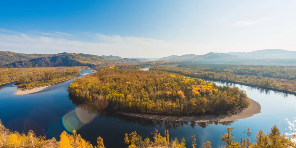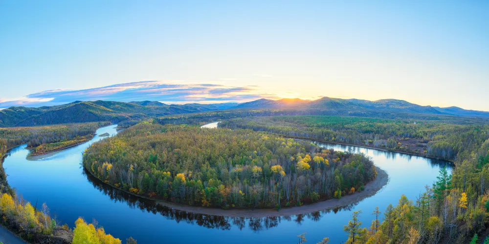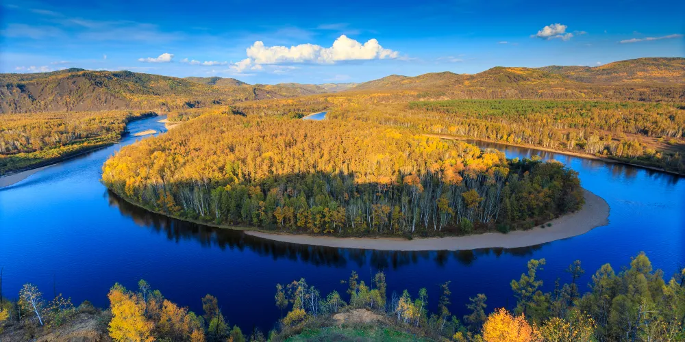 白鹿島位於莫爾道嘎國家森林公園內,距離山門100公里左右。激流河注入額爾古納河入河口上游處,有兩個修長小島相偎而卧,河水呈“S”形迴環於兩個小島之間,且島上野花叢生,紅豆遍地,松黛樺橙,山光水色,美不勝收,這便是白鹿島和蒼狼島。白鹿島風光夏秋兩季有不同風貌,夏天基本呈現綠色,而秋天卻有着不同的顏色層次,是攝影的大好時機。