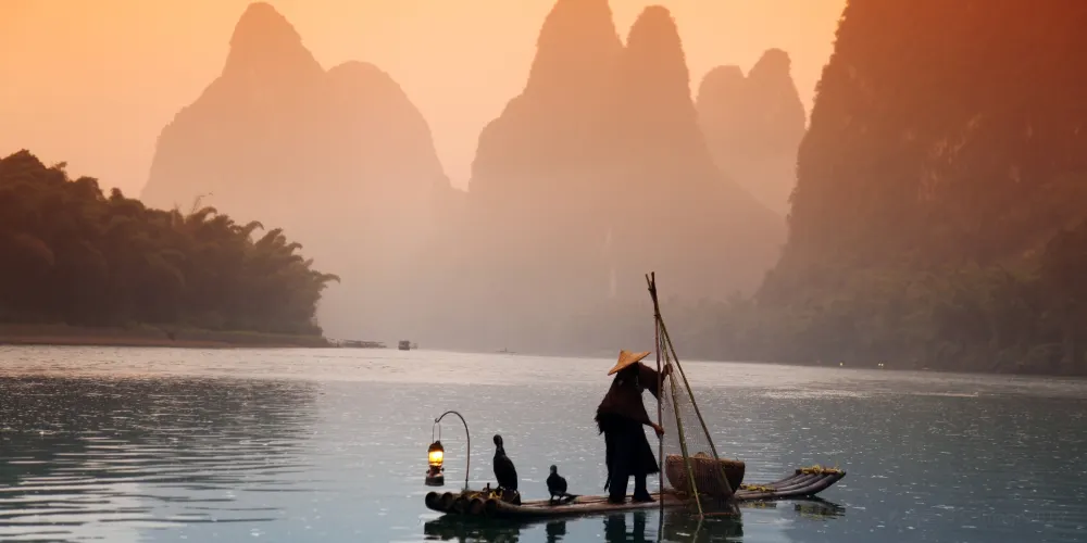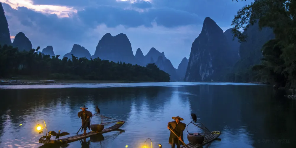 中國陽朔的"白沙漁火"是漓江上傳承四百餘年的傳統漁事活動,也是"陽朔八景"中富有詩意的夜景之一。這景觀形成於漓江流經碧蓮峰時形成的白沙灣,每當暮色降臨,漁民便駕著竹筏,點燃汽燈或火把,驅趕鸕鶿潛入水中捕魚。數十張竹筏在江面游弋,點點漁火與月光、波光交相輝映,宛如繁星灑落江面,構成"一江燈火滿江紅"的絕妙畫卷。自宋代起,這種獨特的夜間捕魚方式就因其藝術美感而備受文人推崇。漁民們透過拍打水面、高聲吆喝的方式驅趕魚群,訓練有素的鸕鶿則如利箭般穿梭捕魚,整套流程充滿韻律感,被澳大利亞學者奧格特姆譽為"自然與文化的交融"。 「白沙漁火」不僅是漁民生活的一部分,更是陽朔文化的重要像徵。它承載著歷史的記憶,傳遞人們對大自然的敬畏與對生命的熱愛。