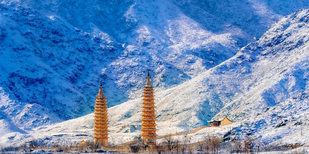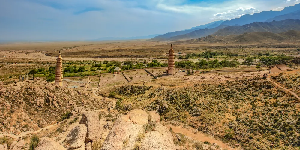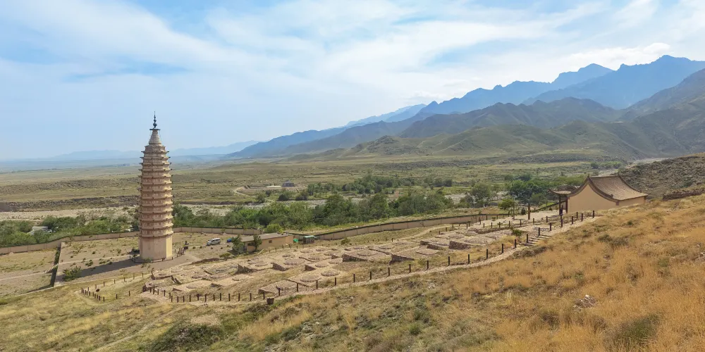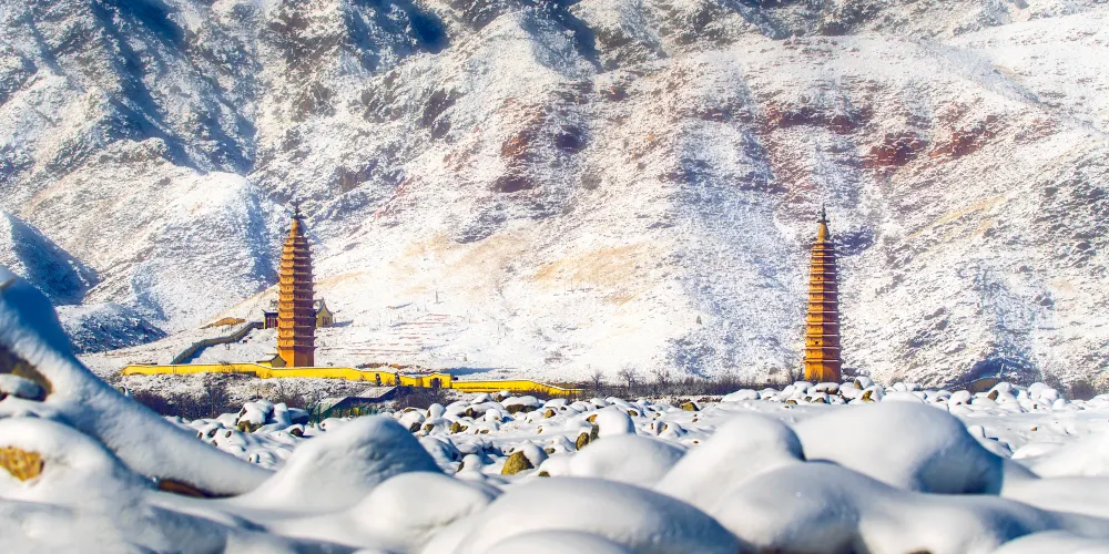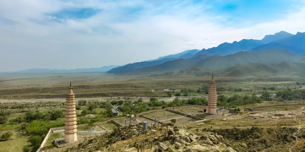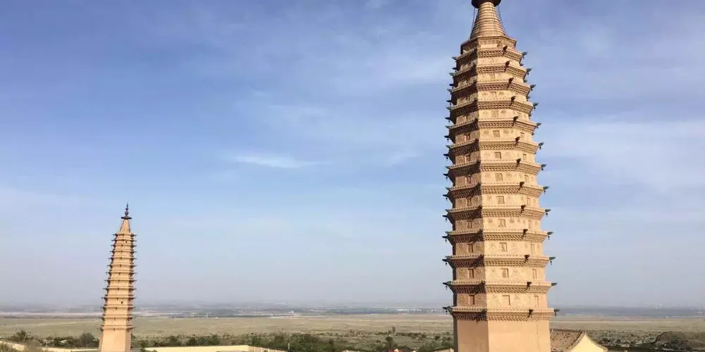雙塔東西相對,相距約百米,皆為八面十三層樓閣式磚塔。兩塔直起平地,沒有基座,底層較高,平素無飾,正南闢券門,可進入厚壁空心筒狀塔窒。東塔總高約39米,塔身呈錐體。每層巾疊澀稜角牙和疊澀磚構成腰檐,腰檐外挑。塔頂上砌八角形平座,平座中間為一網形剎座,上承“十三天”寶剎。二層以上,每層每面都貼有彩塑獸麪兩個,左右並列,怒目圓睜,獠牙外露,十分威猛。獸麪口銜彩繪紅色連珠。獸麪之間,是彩繪雲託日月圖案。塔壁轉角處裝飾彩塑寶珠火焰。西塔總高約36米,塔體比例協調,比東塔較為粗壯。二層以上由數層疊澀稜角牙和疊澀磚構成腰檐,腰上砌成平座,外檐飾以圓形獸頭構件。塔頂上承八角形剎座,剎座檐下,飾以並排彩繪蓮瓣。轉角處飾以磚雕力神,力神挺腹,手託蓮座,栩栩如牛。剎座上承“十三天”寶剎。二層之上每面腰檐下均有彩塑佛像及裝飾圖案。各層壁麪中心置長方形淺佛龕,龕內有彩塑動物和八寶圖案,龕兩側為彩塑獸麪,獸麪口含流蘇七串,呈形下垂,佈滿壁麪。獸麪怒日網睜,獠牙外齜,威猛可怖。西塔止東面第十二層佛龕內右上側,有西夏文。在第十層正東的甲座上,放置着一個完整的綠色琉璃套獸。塔頂佛龕內置有一根六稜木質中心剎柱,直徑約30釐米,剎柱上有墨書西夏文題記和梵文字。雙塔建築綜合了中原佛塔傳統特點,又把繪畫和雕刻藝術結合起來,構成了兩座雄偉壯觀、絢麗多彩的藝術珍品。1986年,國家組織力量對雙塔進行了加固維修,在維修西塔塔剎時,一密封空心穹室內置放着一批文物,有蒙古汗國銀幣“大朝通寶”、元初“中統寶鈔”、絹質“彩繪佛畫”(唐卡)、“絹紙花”,木雕“上樂金剛雙身像”、“木花瓶”和銅佛像等。雙塔1988年被國家列為第二批全同重點文物保護單位。