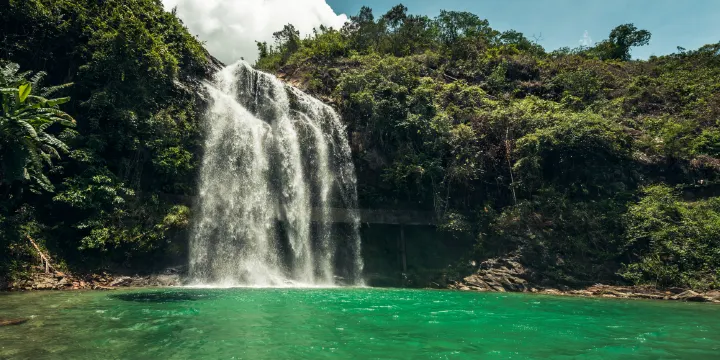 百潭谷是位於揭西五經富鎮中和村庵背的磜牆崆瀑布,因秀麗的風光被盛讚為“人間仙境”。皆因晴空萬里時,從山頂往下望去,一個個獨立的潭猶如碧玉般無瑕,又因這裏的石頭在日光映照下,呈現出了斑斕五彩而得名。這是令人心馳神往的遊覽勝地,這裡是廣東美景的精華所在,這裡是人間的仙境,這裡是嶺南客家人的九寨溝。山翠,石紅,水碧,天下獨一。