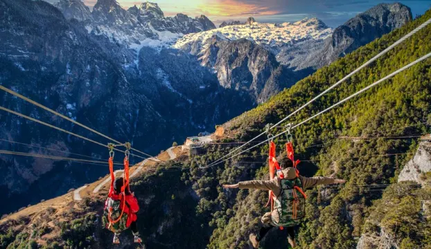從雪域聖境下行,迎接你的是垂直落差700米的峽谷絕唱。懸空木棧道如緞帶纏繞絕壁,一聲呼喊便能喚醒群山的和聲。行至盡頭,全透明玻璃觀景台讓你步入雲端。回程可選滑索,在百米高空劃過峽谷,完成一次勇敢者的飛翔。