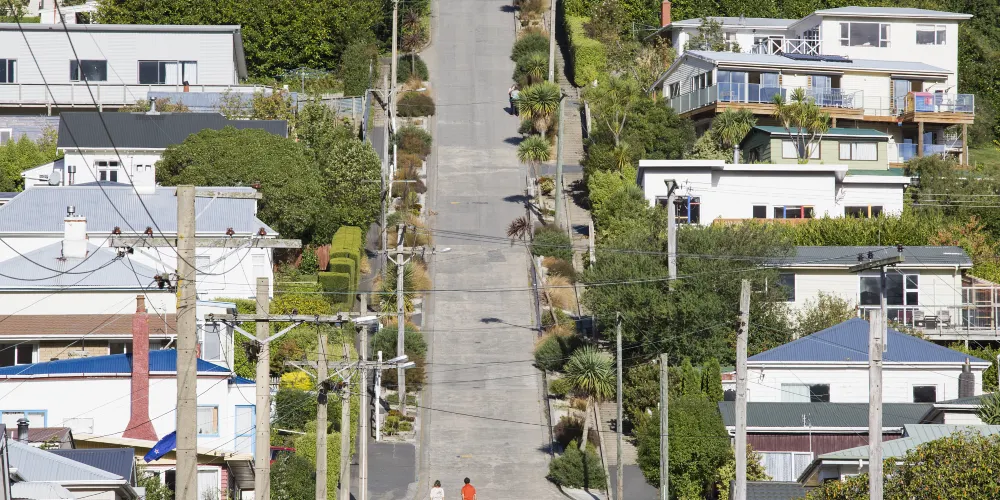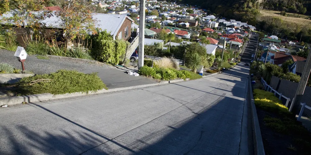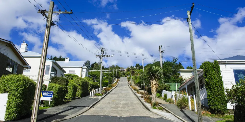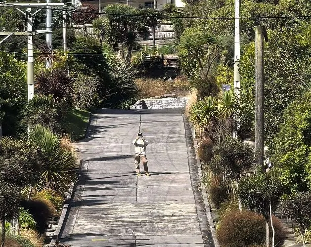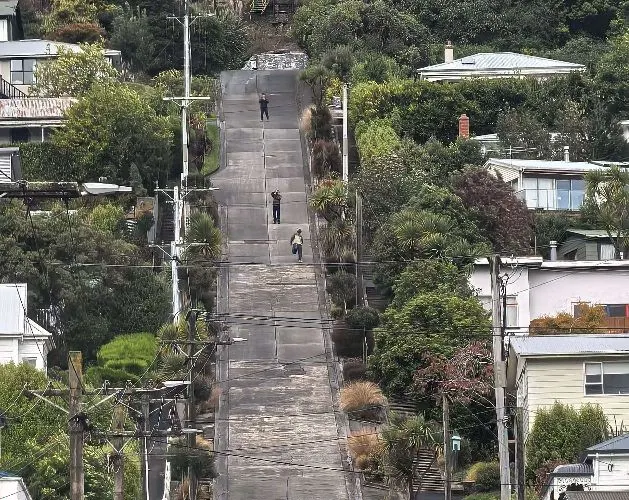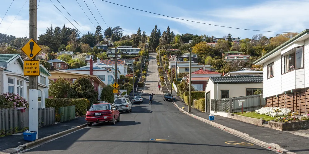 但尼丁的鮑德溫大街(Baldwin St.),坡度為35%,是世界上最陡峭的有人居住的街道。走在這條長度約350米的街道上,平均每走2.86米,高度就提升1米,“爬”到路的盡頭,感覺猶如在登山。