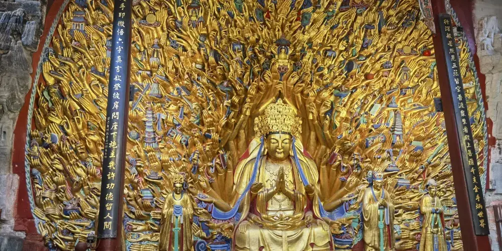 寶頂山景區位於大足區龍崗鎮東北的寶頂鎮。名僧趙智鳳於此建石窟寺,歷時數十年建成,是佛教聖地之一,有“上朝峨嵋,下朝寶頂”之說。寶頂山景區的石刻造像以大佛灣為中心,東有小佛灣、倒塔、龍頭山等,南有高觀音,西有廣大山、松林坡等,北有岩灣、龍潭、對面佛等。寶頂山石刻的表現形式在石窟藝術中獨樹一幟。大佛灣數千尊造像題材不重複,龕窟間既有教義上的內在聯繫,又有形式上的相互銜接,形成一個有機的整體。