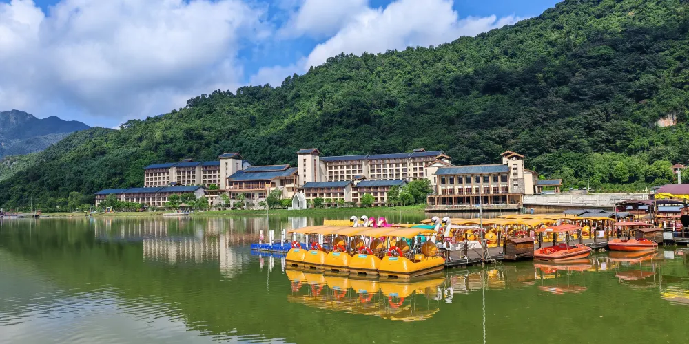來到景區,未入“宮”門,其風景色已讓人駐足:三面環山、平靜如鏡的宝晶湖倒影著山色,幾座青翠的孤山錯落湖濱,九曲木橋連接湖心亭台,舟泛湖中,美景天成。