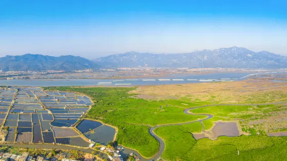 漳州海底森林是一處罕見的紅樹林,位於漳江出海口處的海灘邊。漲潮時,這些樹木被海水吞沒,衹有略高些的在海面上稍露枝頭。落潮時,它們從海灘上露出,迎風搖曳。