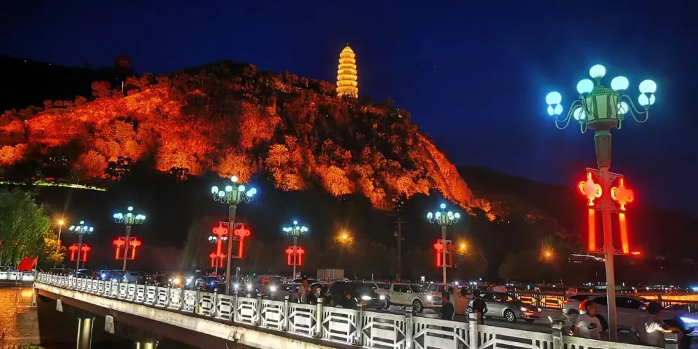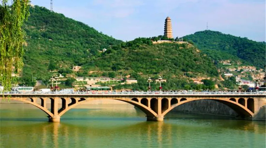 寶塔山下的延河橋,是一座繼承和發展了我國古代敞肩式拱橋建築傳統技藝的石拱橋,有着濃郁的民族風格。全橋總長123米,3孔凈跨各30米,主拱採用立牆空腹拱的形式,即在每個大跨上設有6個小拱,橋身輕秀,承載力強。寶塔山和延河橋,相諧相輝,已經是延安革命聖地的象徵,是城市的標誌,更是攝影、繪畫的重要景點。在建橋過程中延安人民發揚艱苦奮鬥的光榮傳統,根據延河不需要通航,河床上又是砂質土壤的特點,採用“土牛拱胎”的施工方法,即在河床上用土堆成拱形,作為砌築拱圈的胎模,這就大大降低了工程造價。延河大橋建成後,其建築藝術受到了各方面的好評,資深的橋樑文化研究專家王展意著文讚揚説:“延河大橋選址得當,佈局合理,造型美觀,工藝精湛,與附近的青山綠水、寶塔古城,聯芳濟美,相映成趣。”如今,在延河的河床上砌上了石塊,岸上築起了水泥護欄和燈柱,柱上是乳白色的圓形電燈,入夜後兩岸成為了一條明亮的燈線。在雄偉的寶塔上與壯觀的延河大橋上燈飾斑斕,幾乎為輝煌的透明體,相互映照之下格外瑰麗迷人。