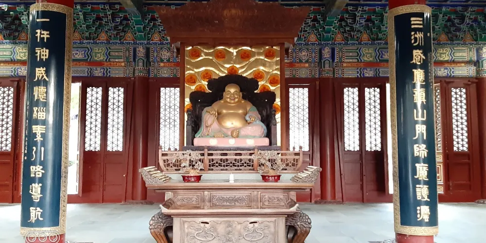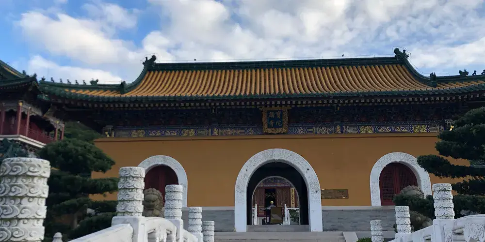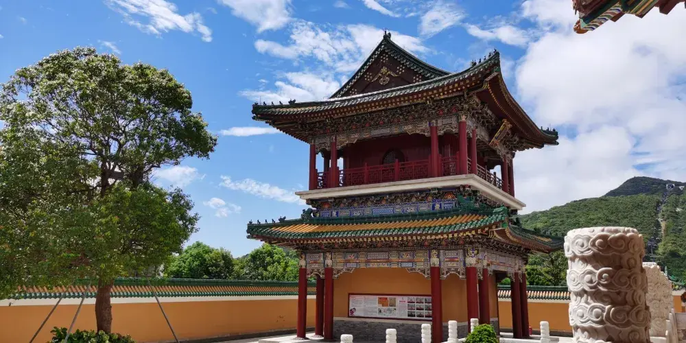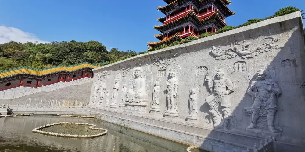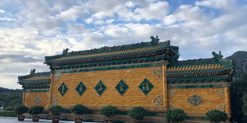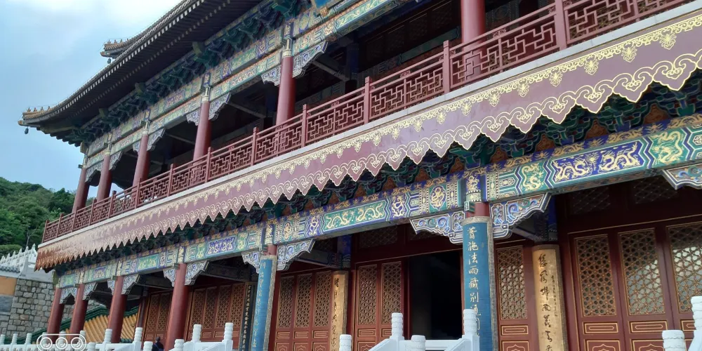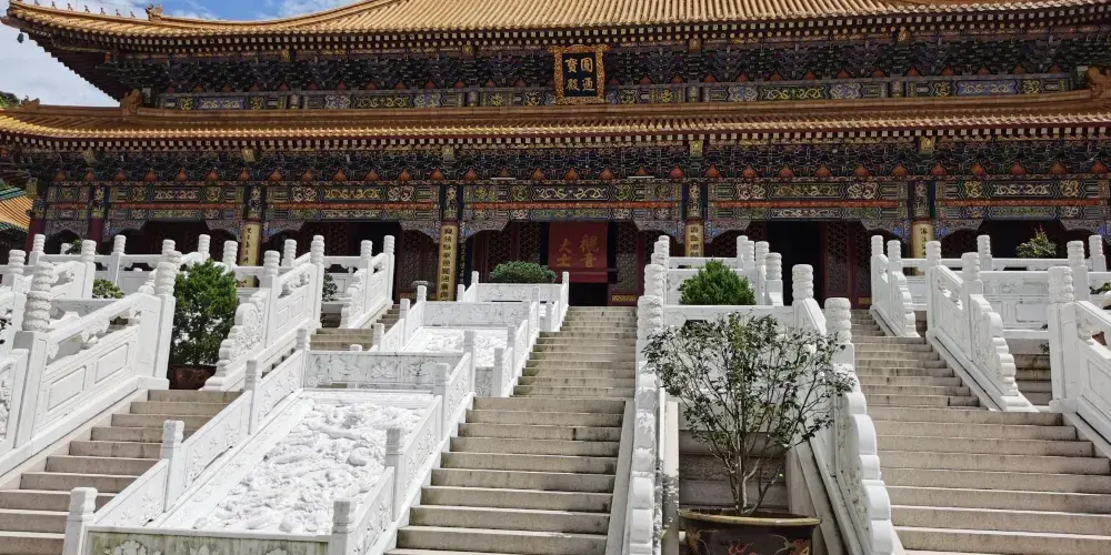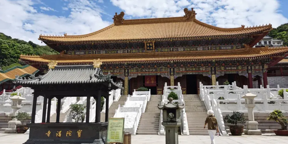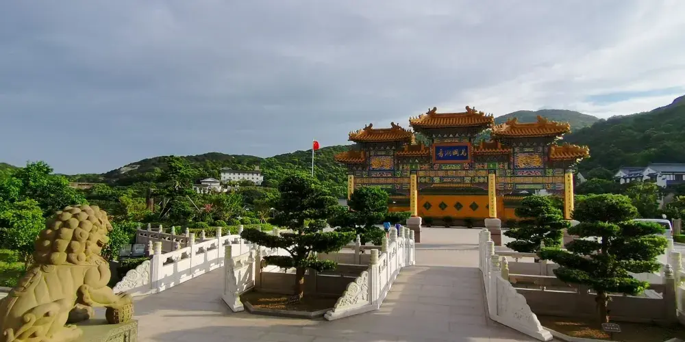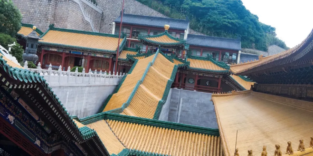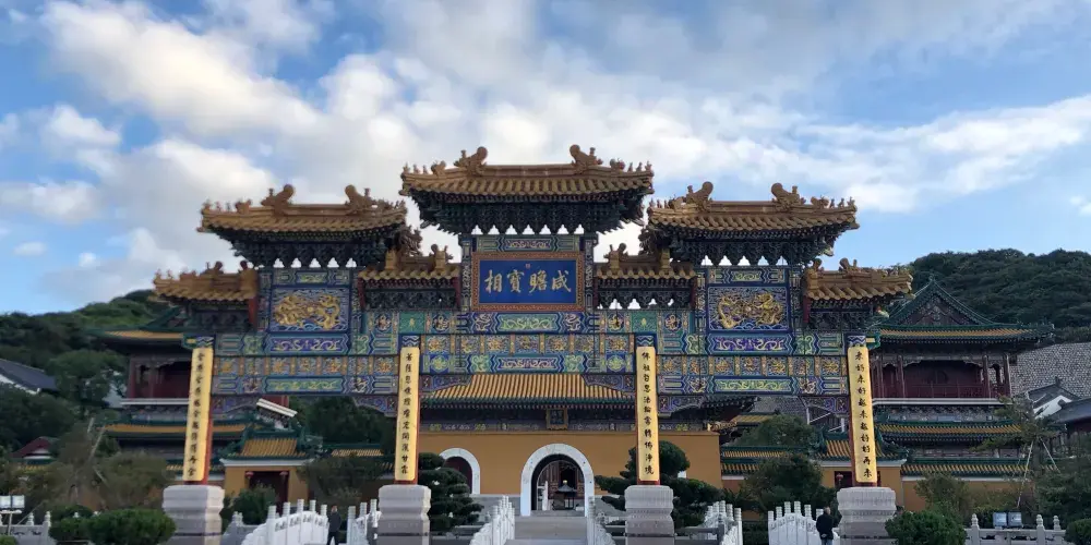 寶陀講寺位於萬佛塔對面,佛頂山索道下站附近,是普陀山上近些年新修的一處寺院。由於規模與普濟寺相近,因此也被許多人稱為普陀山第四大寺。這座新修的寺院給人直觀的感覺是恢弘大氣,整個寺院依山而建,仿清朝皇家風格的建築配上大理石的台階,壯觀又不顯做作。去到寶陀講寺的交通很便利,坐島上的巴士到索道站,再步行一會兒就能到。寶陀講寺的中軸線主體建築如鐘鼓樓、天王殿、大圓通殿、大講堂和大寶閣樓等,採用的是北方明清宮廷式建築風格,嚴謹中透着不可侵犯的威嚴;東西兩側建築如方丈院、庫房和僧寮,採用的是採用南方古建築風格,為這神聖之地增添了幾許親和婉約的氣息。寺中大的看點,一處是西北側的圓頓戒壇,是江南受戒一大壇。另一處是仿照洛陽龍門石窟修建的寶陀石窟佛像,十分精美。走到寺中高處遠望,視野極好。寶陀講寺雖剛建好不久,香火已然旺盛起來。遊人通常將其作為佛頂山遊程中的一站,游完寶陀講寺,正好乘索道上佛頂山,參訪過山頂的慧濟寺後,再順着香雲路下山,法雨寺就在山下不遠的地方了。